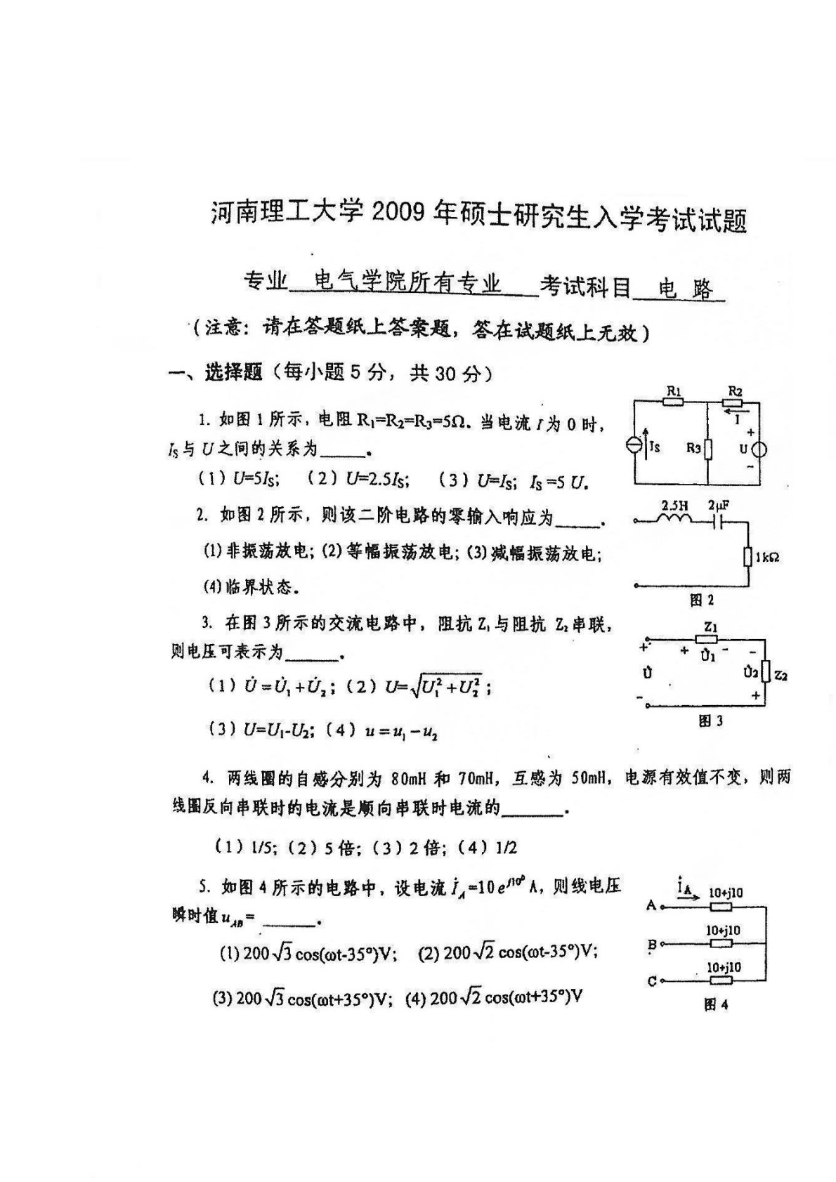 河南理工大学845电路分析基础2009年真题