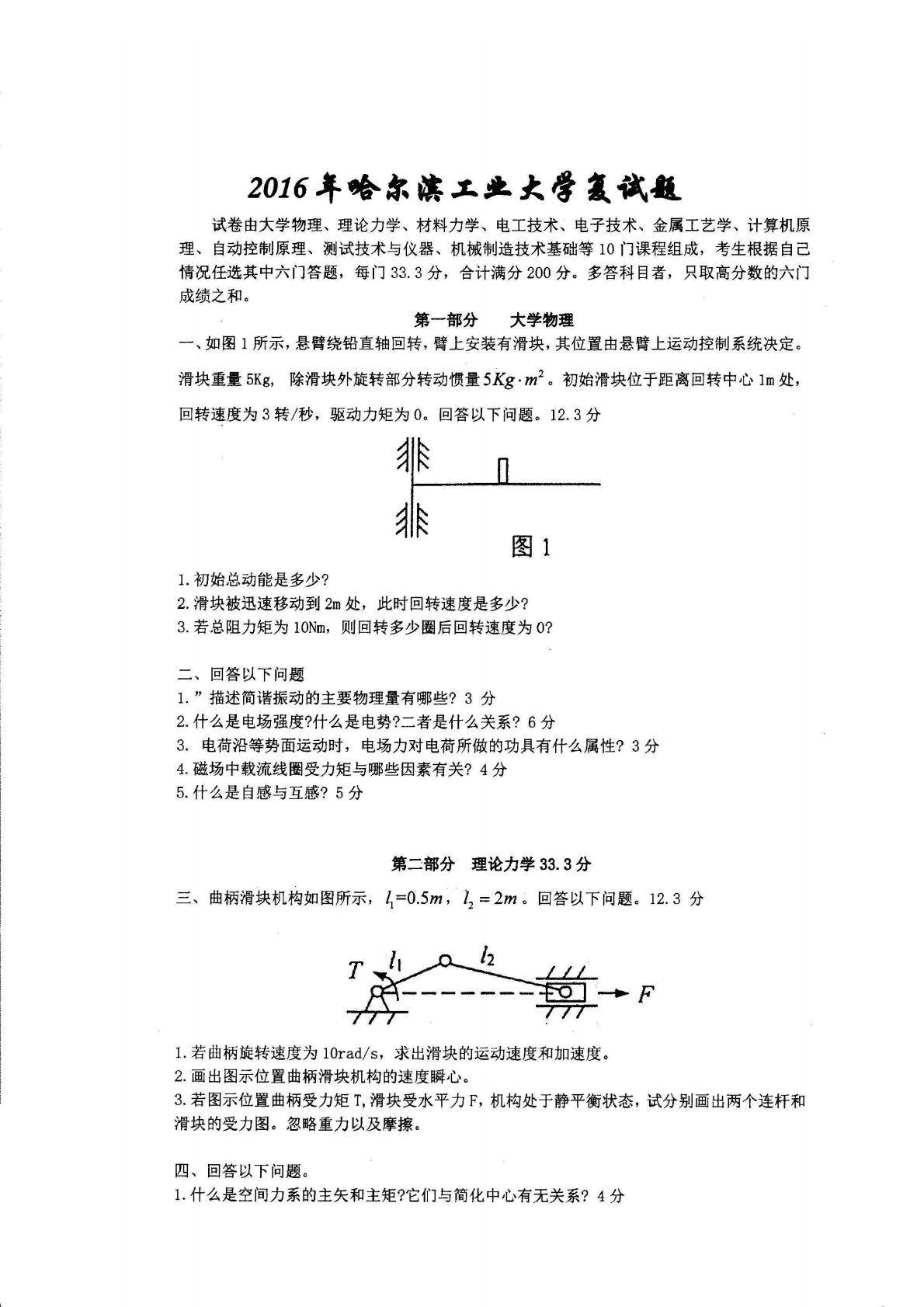 哈尔滨工业大学机械制造及其自动化2016年复试真题