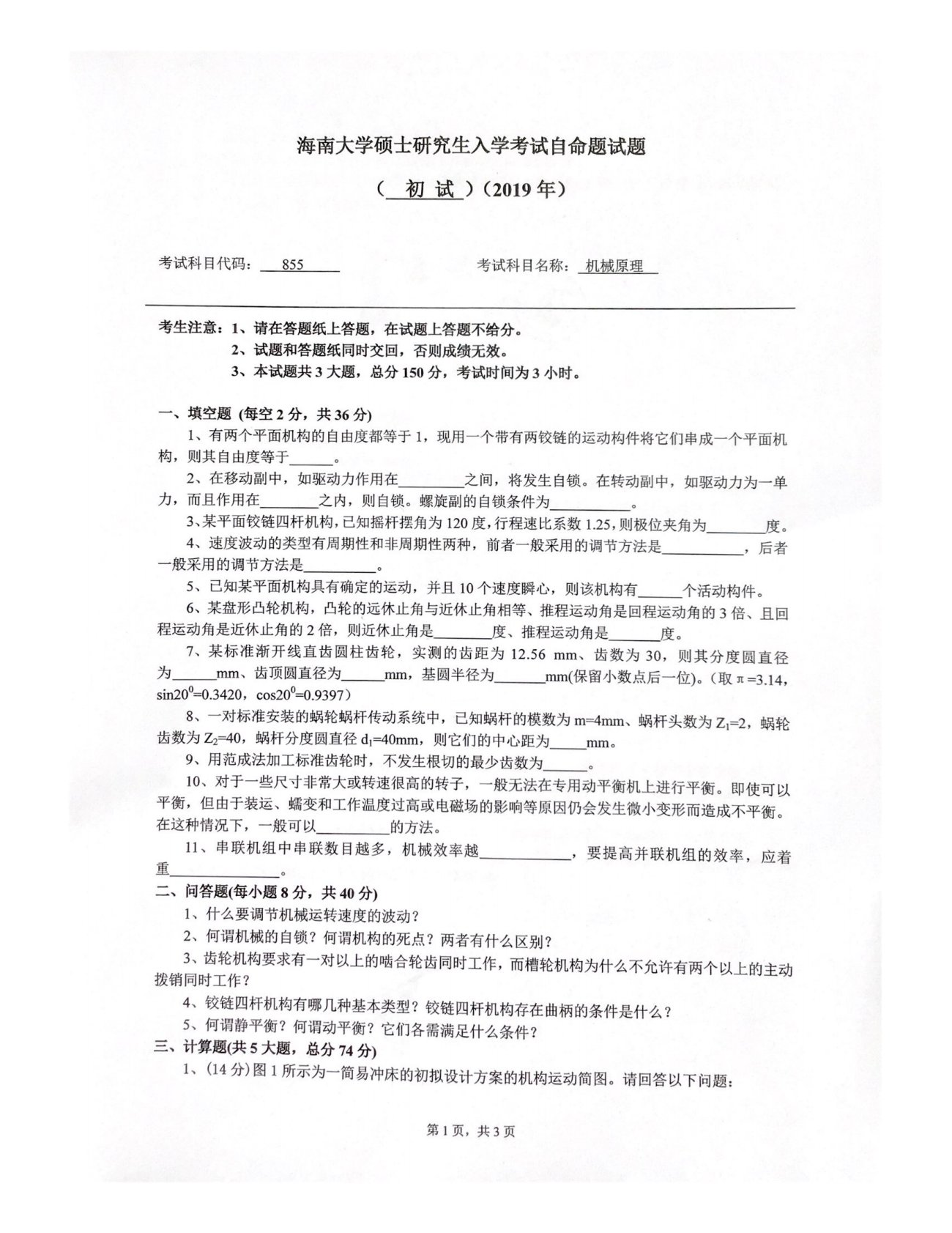 海南大学855机械原理2019年真题
