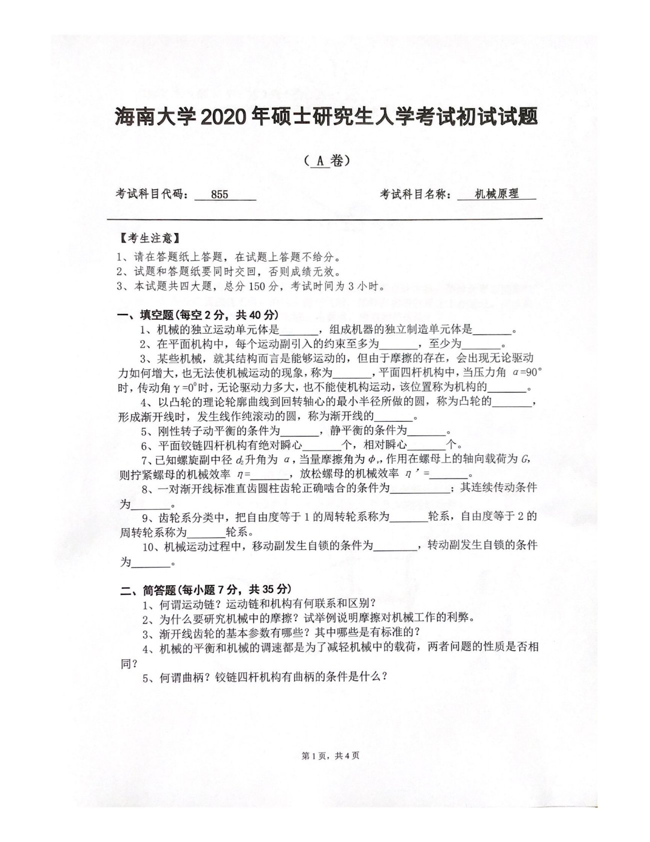 海南大学855机械原理2020年真题