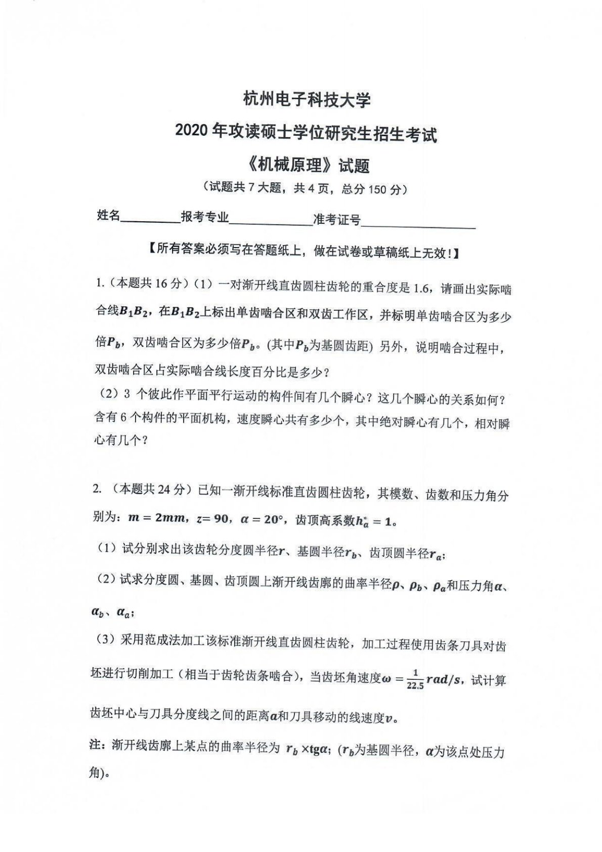 杭州电子科技大学2020年811机械原理真题