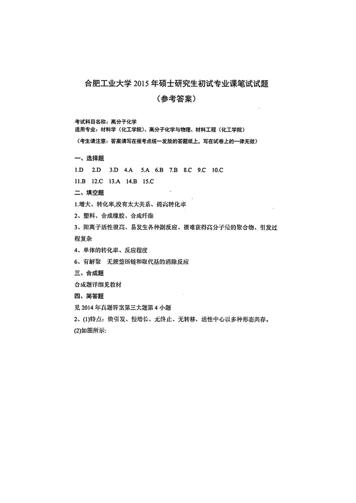 合肥工业大学809高分子化学2015年真题答案