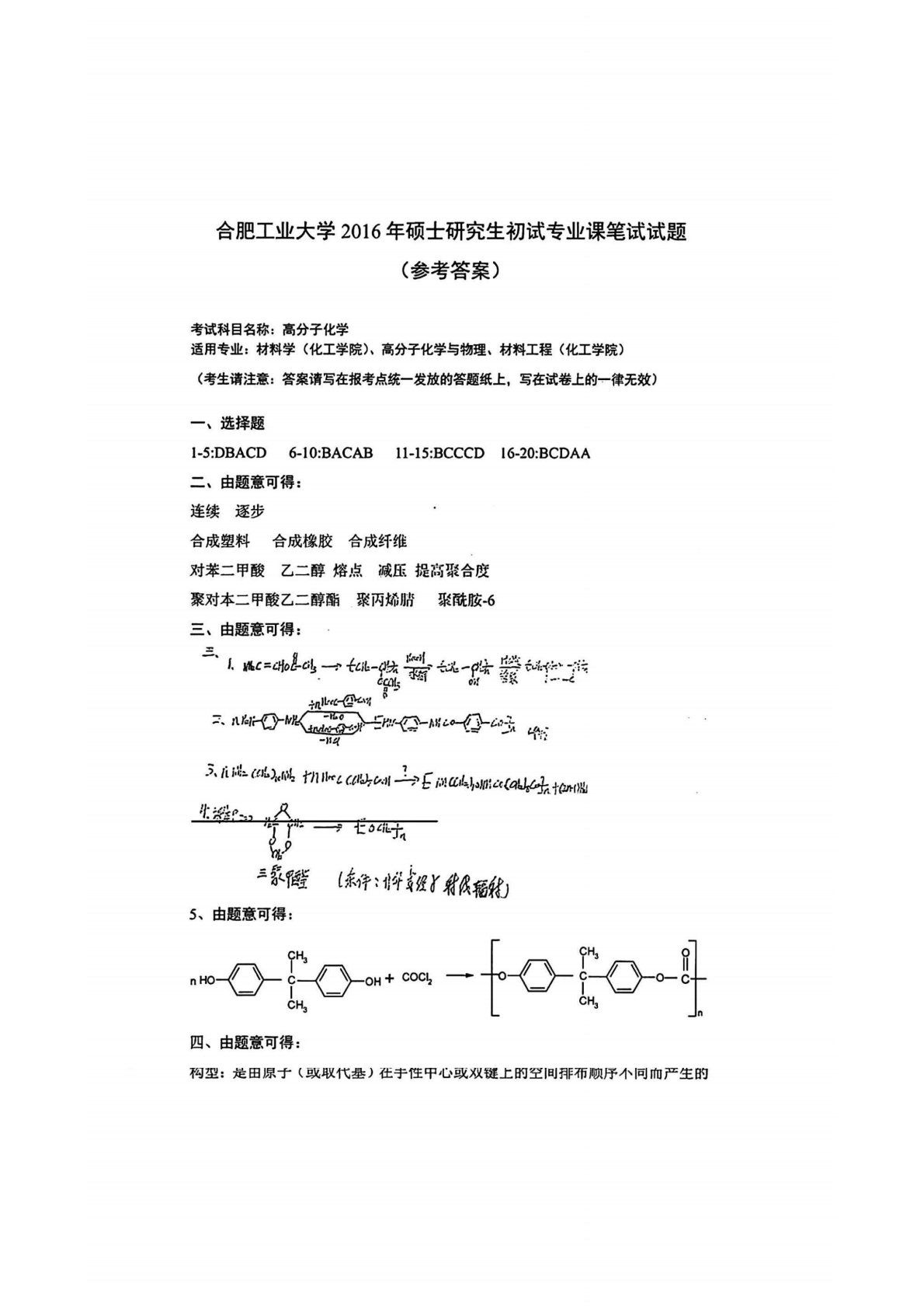 合肥工业大学809高分子化学2016年真题答案