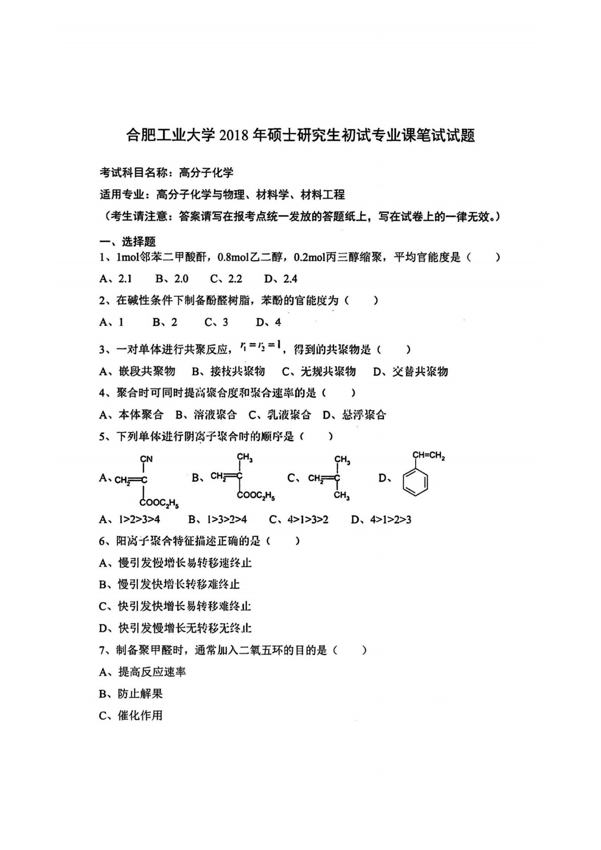 合肥工业大学809高分子化学2018年真题