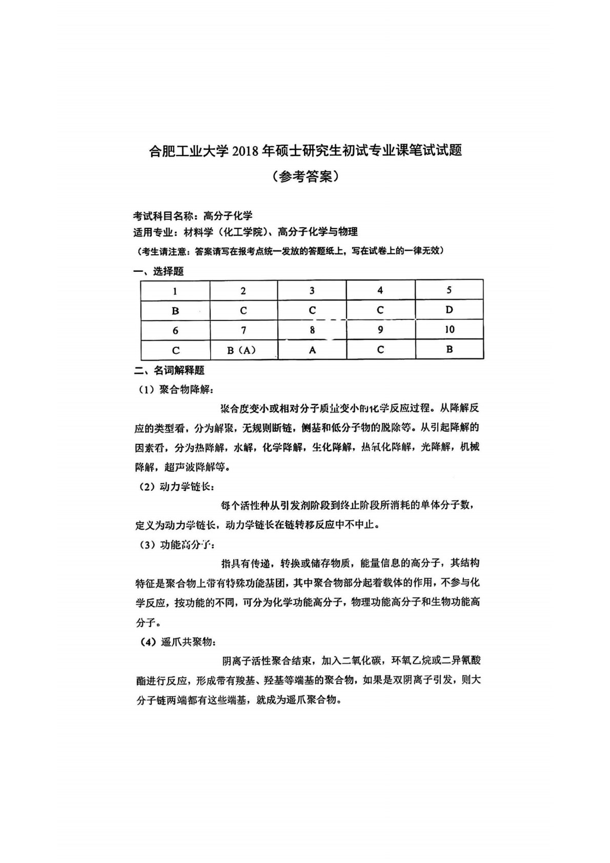 合肥工业大学809高分子化学2018年真题答案