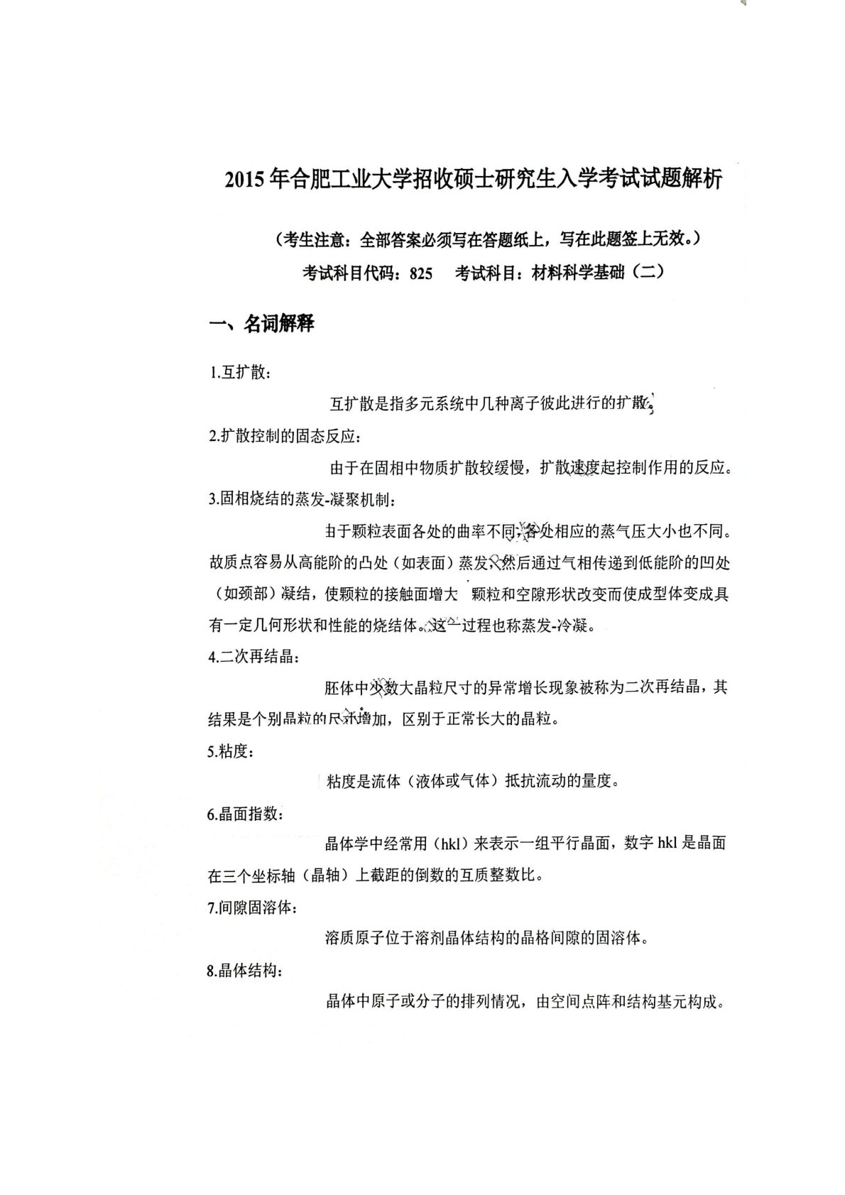 合肥工业大学815材料科学基础2015年真题答案