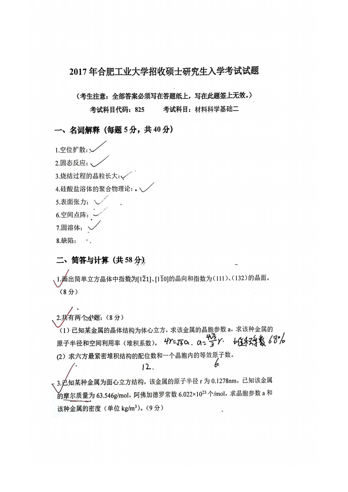 合肥工业大学815材料科学基础2017年真题