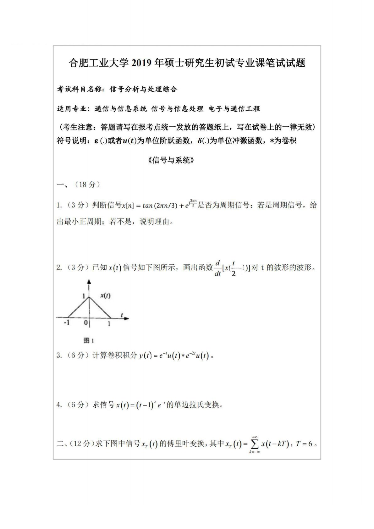 合肥工业大学833信号分析与处理综合2019年考研真题