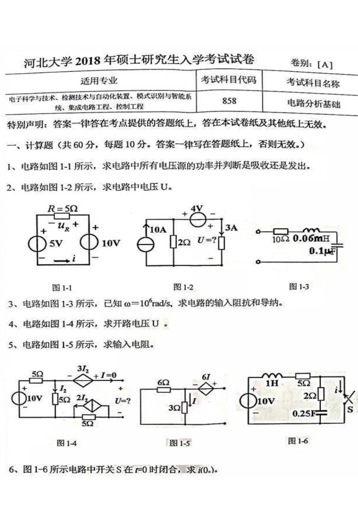 河北大学858电路分析基础2018年真题