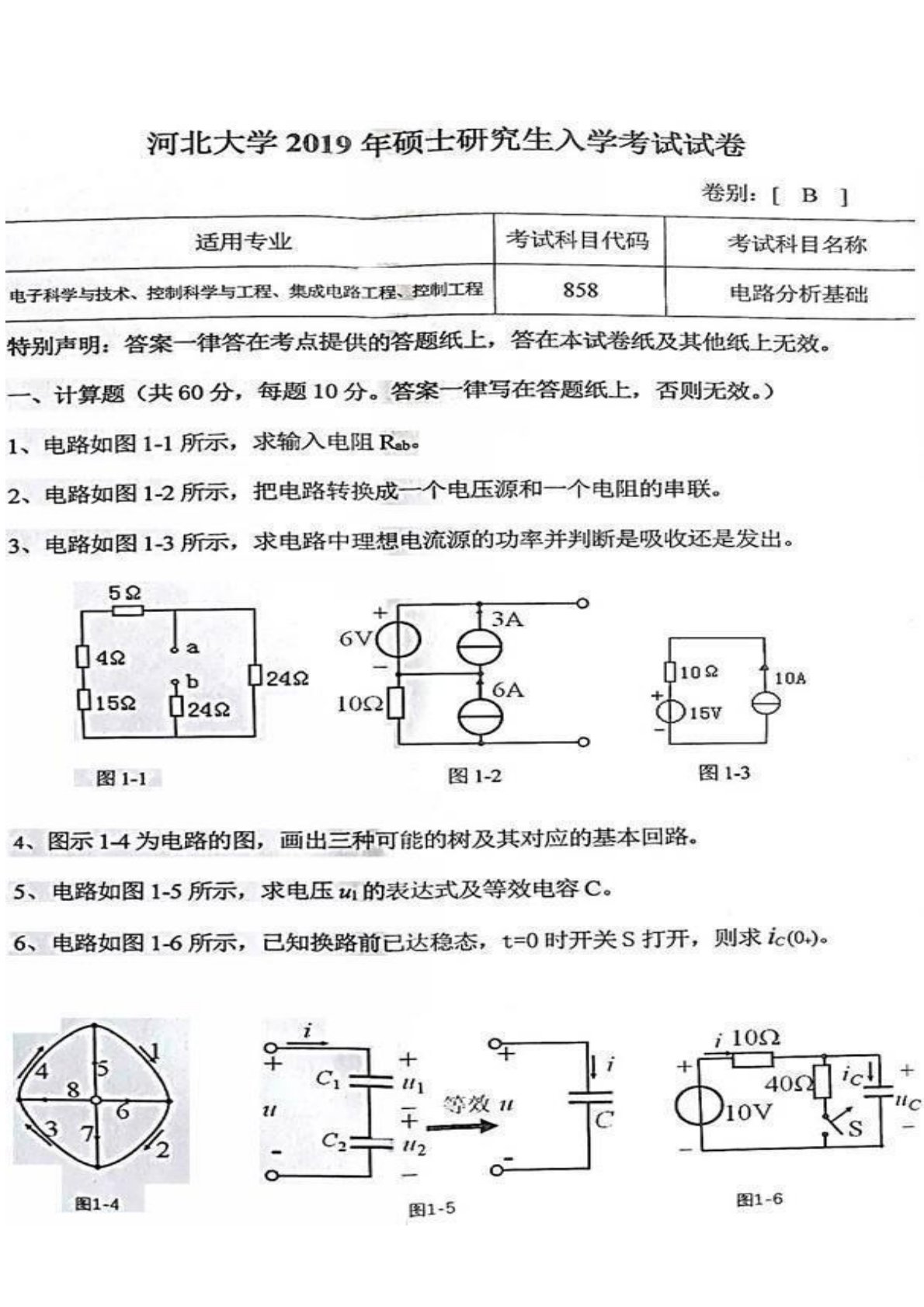 河北大学858电路分析基础2019年真题