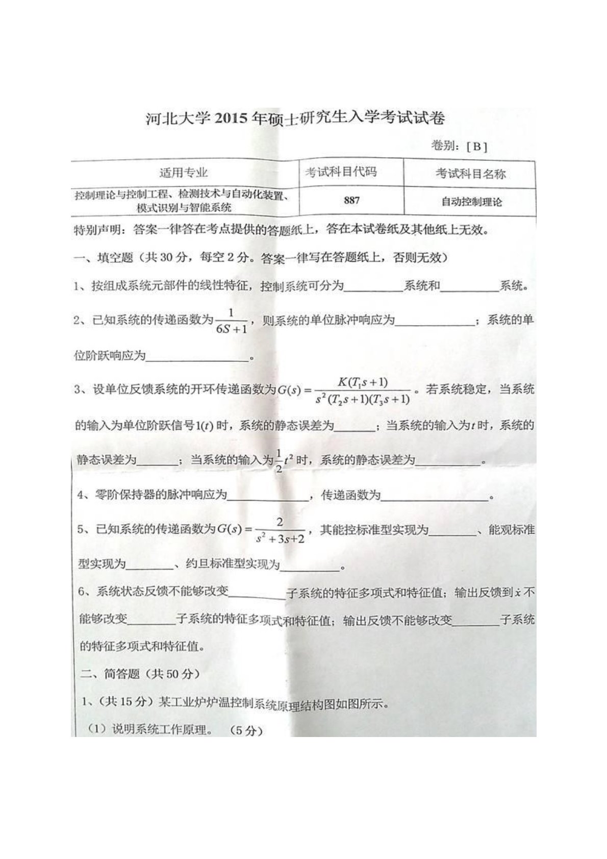 河北大学887自动控制理论2015年考研真题