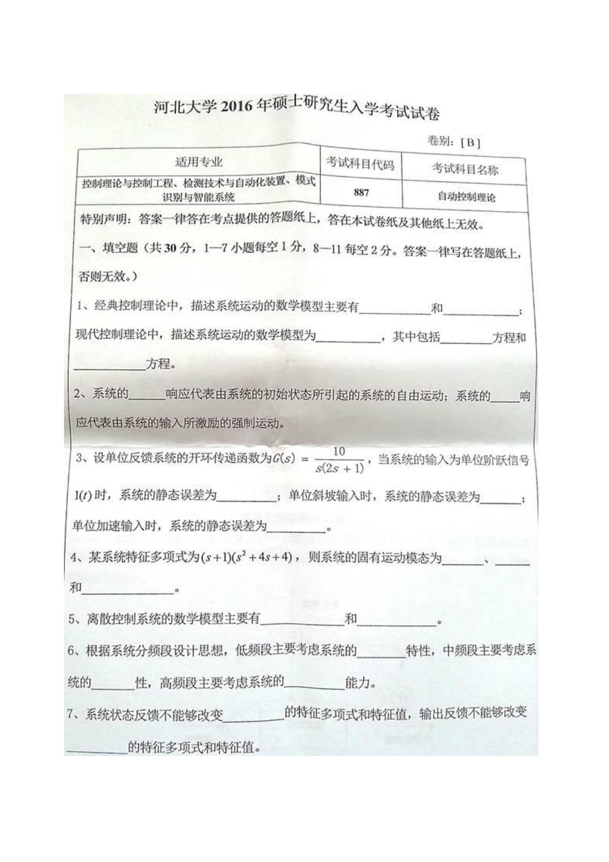 河北大学887自动控制理论2016年考研真题