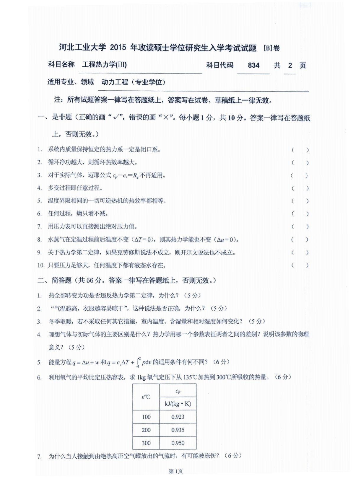 河北工业大学831工程热力学2015年真题