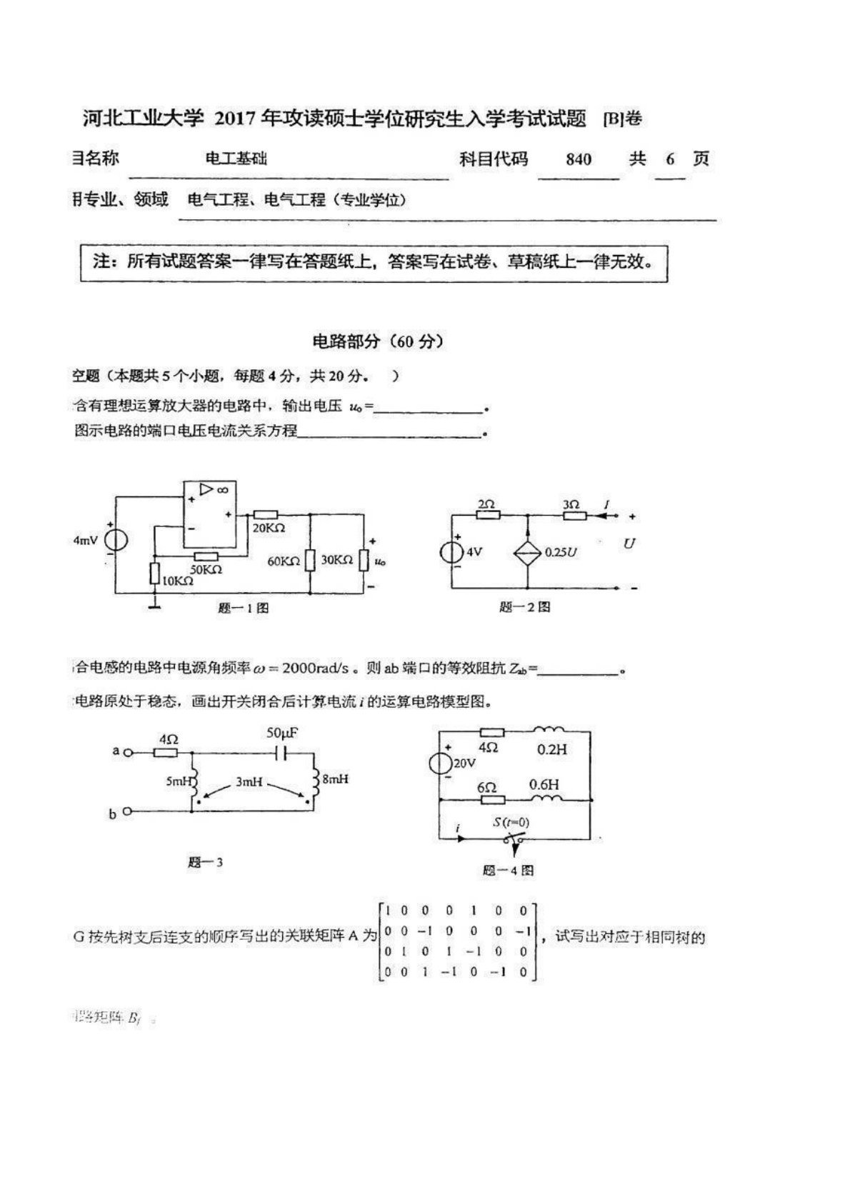 河北工业大学2017年840电工基础考研真题