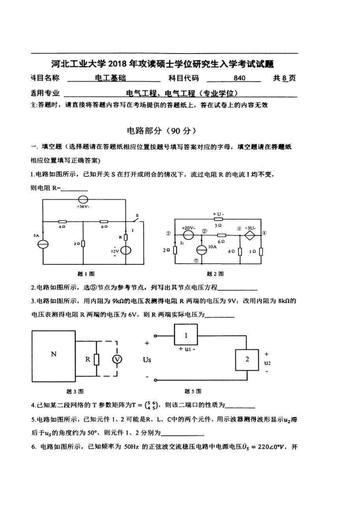 河北工业大学2018年840电工基础考研真题
