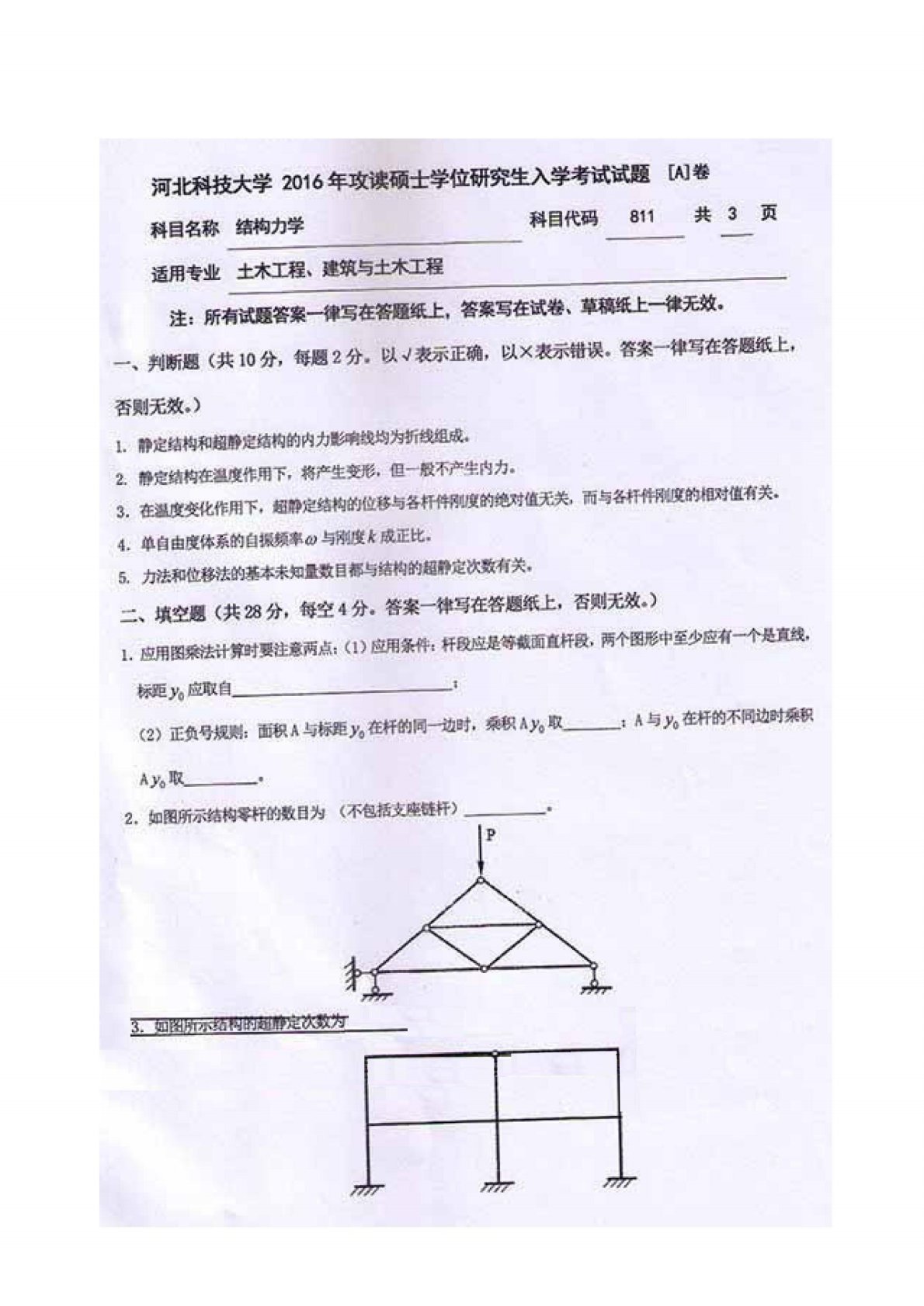 河北科技大学811结构力学2016年考研真题A