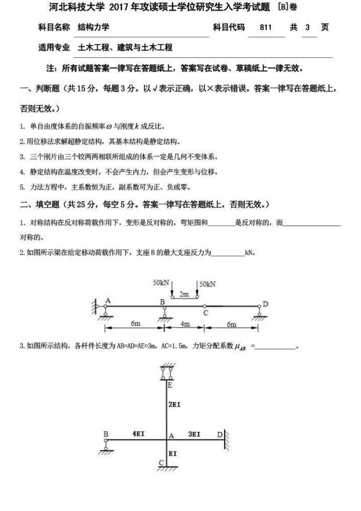 河北科技大学811结构力学2017年考研真题B