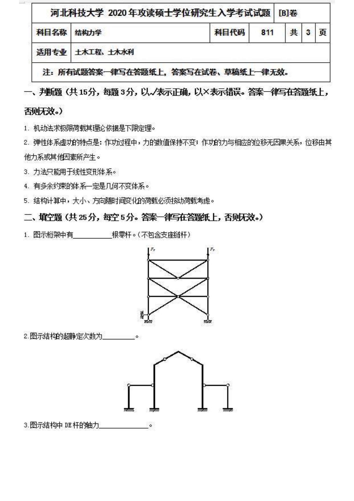 河北科技大学811结构力学2020年考研真题B