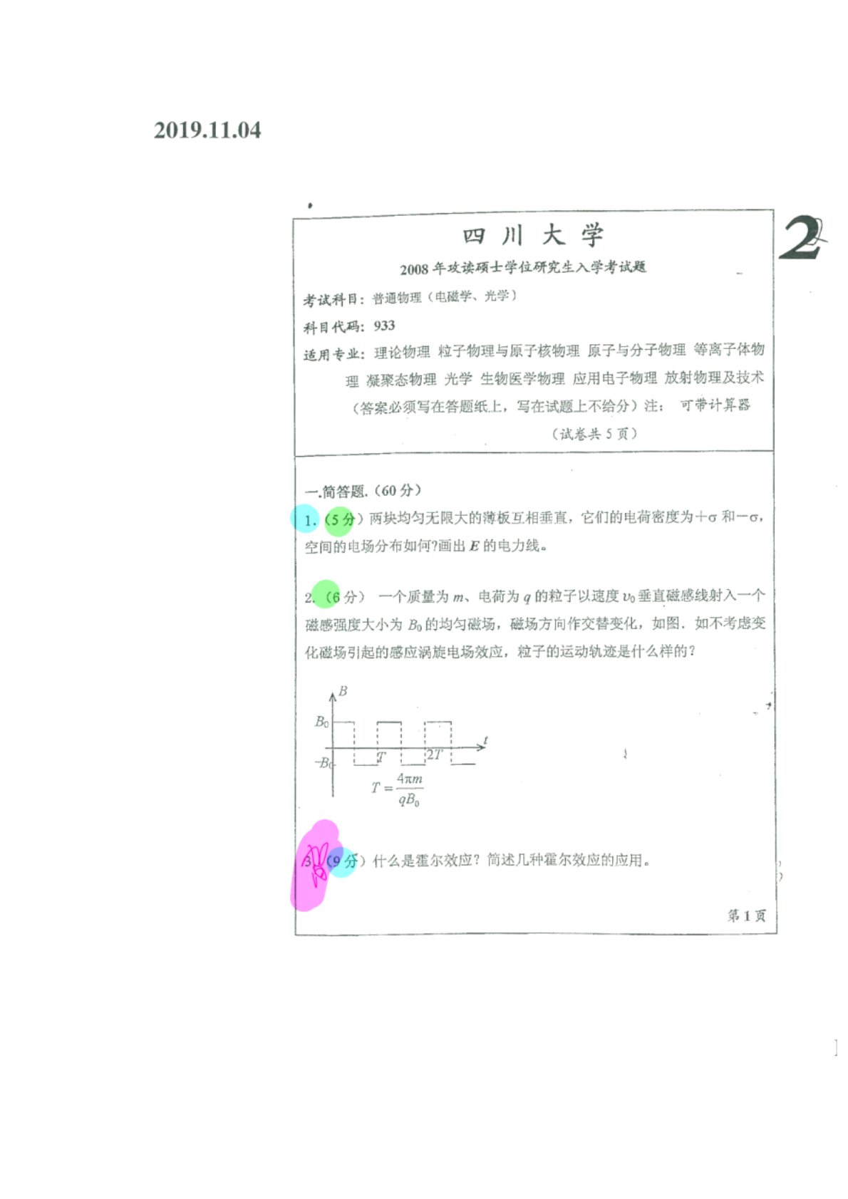 四川大学822普通物理(光学、电磁学)2008年真题1.