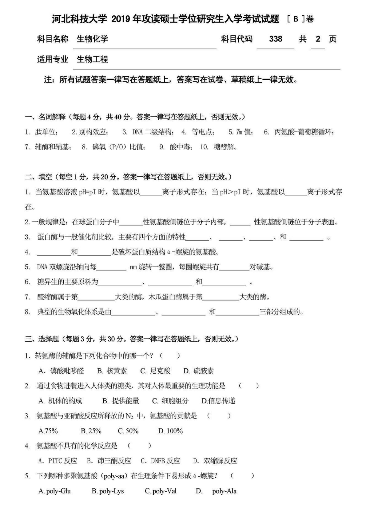 河北科技大学2019年338生物化学考研真题