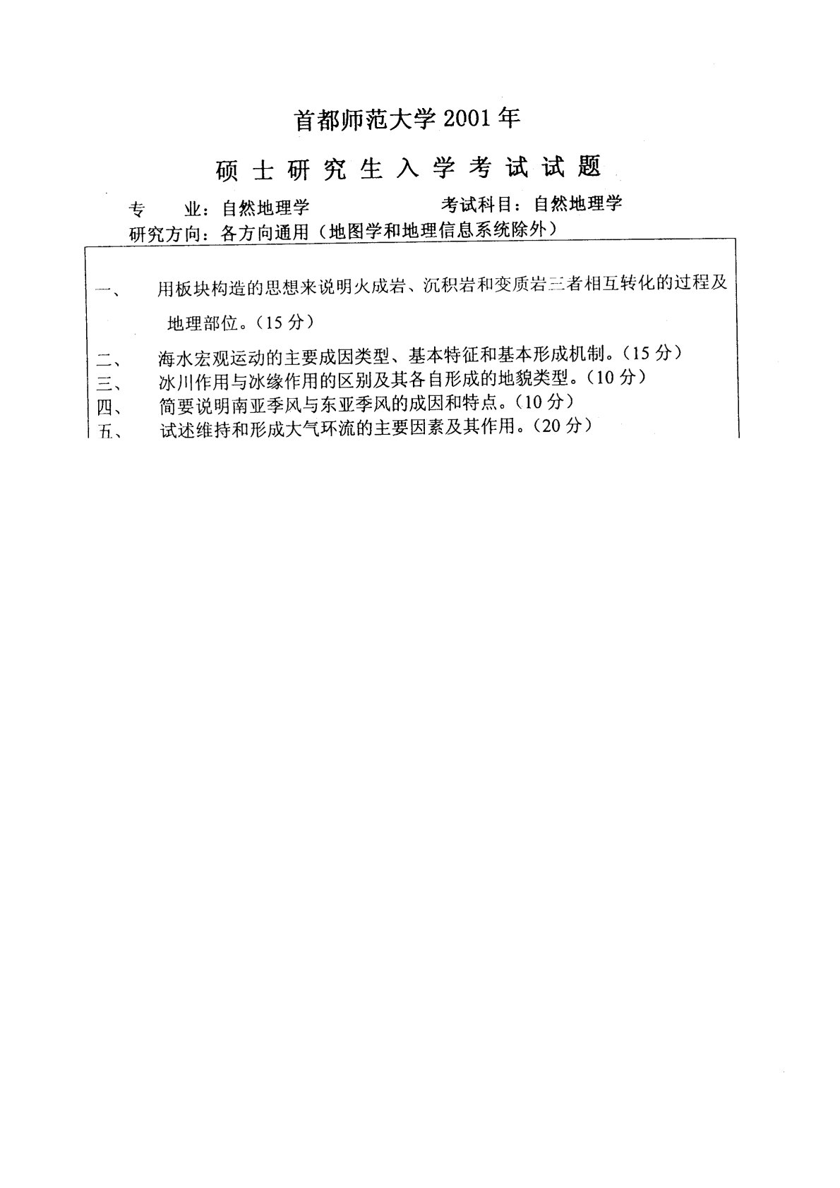首都师范大学833自然地理学2001年真题