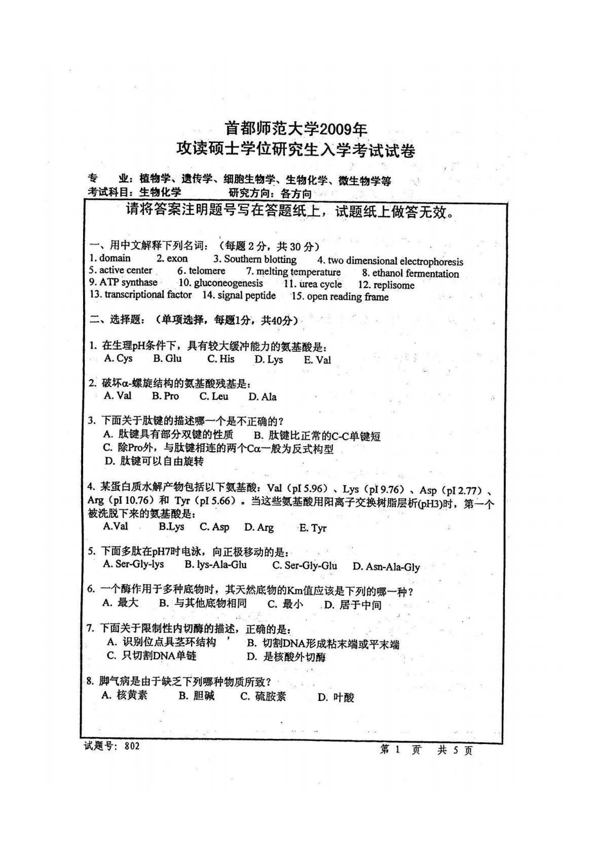 首都师范大学802生物化学与分子生物学2009年真题(生物化学)