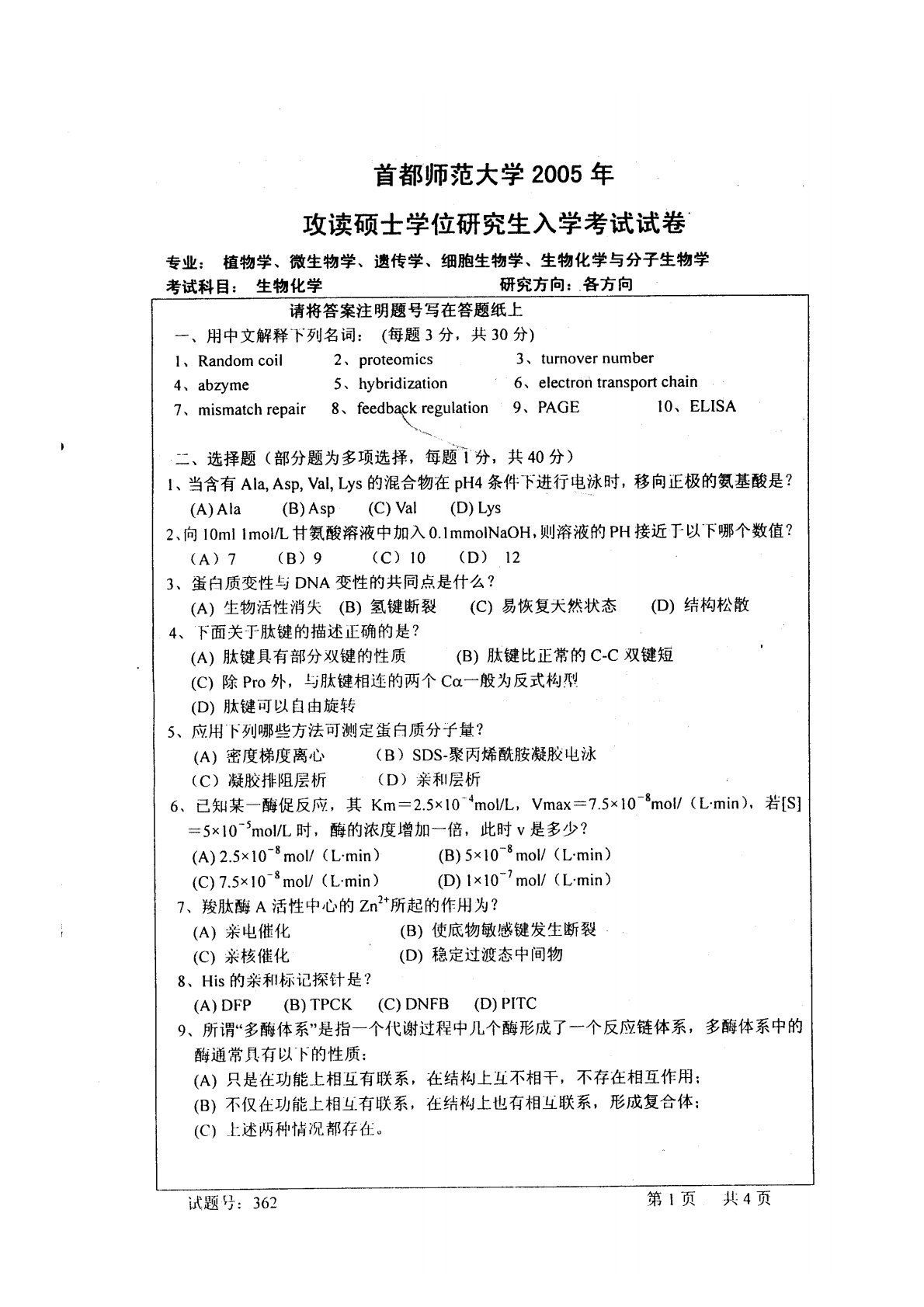 首都师范大学802生物化学与分子生物学2005年真题(生物化学)