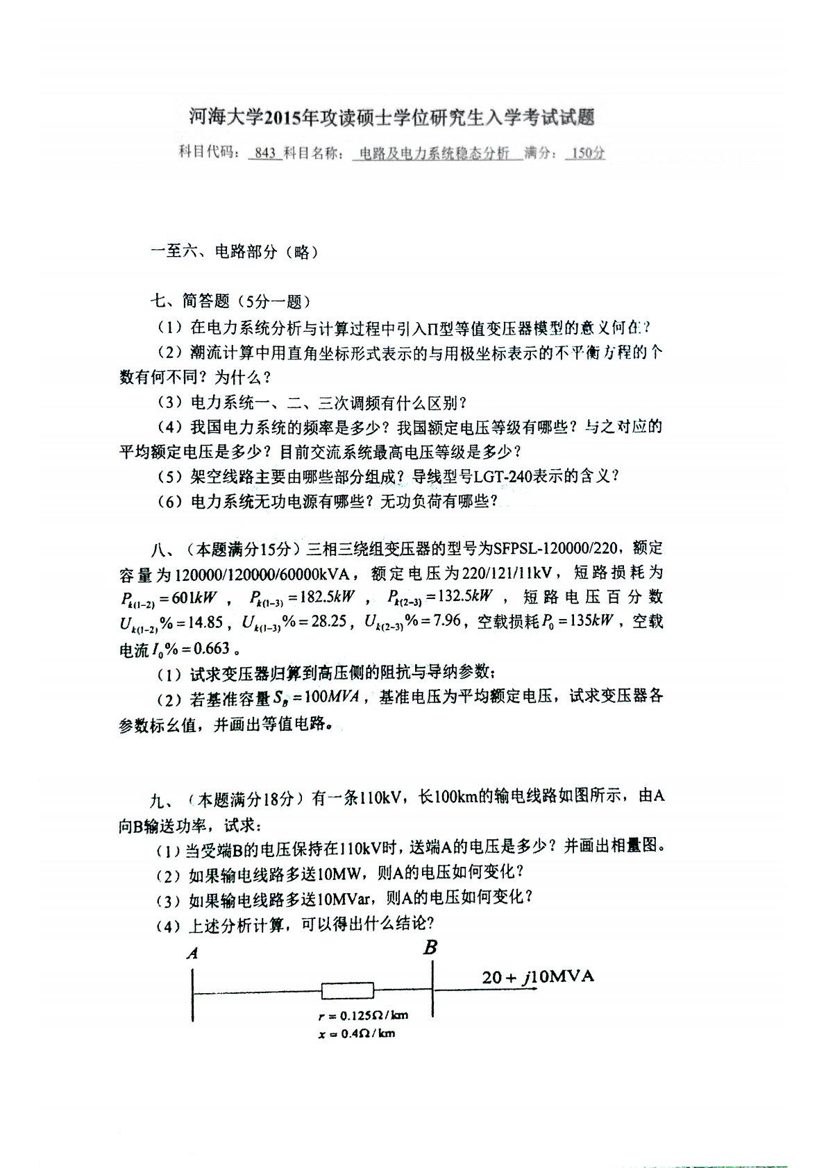 河海大学843电力系统分析2015年真题
