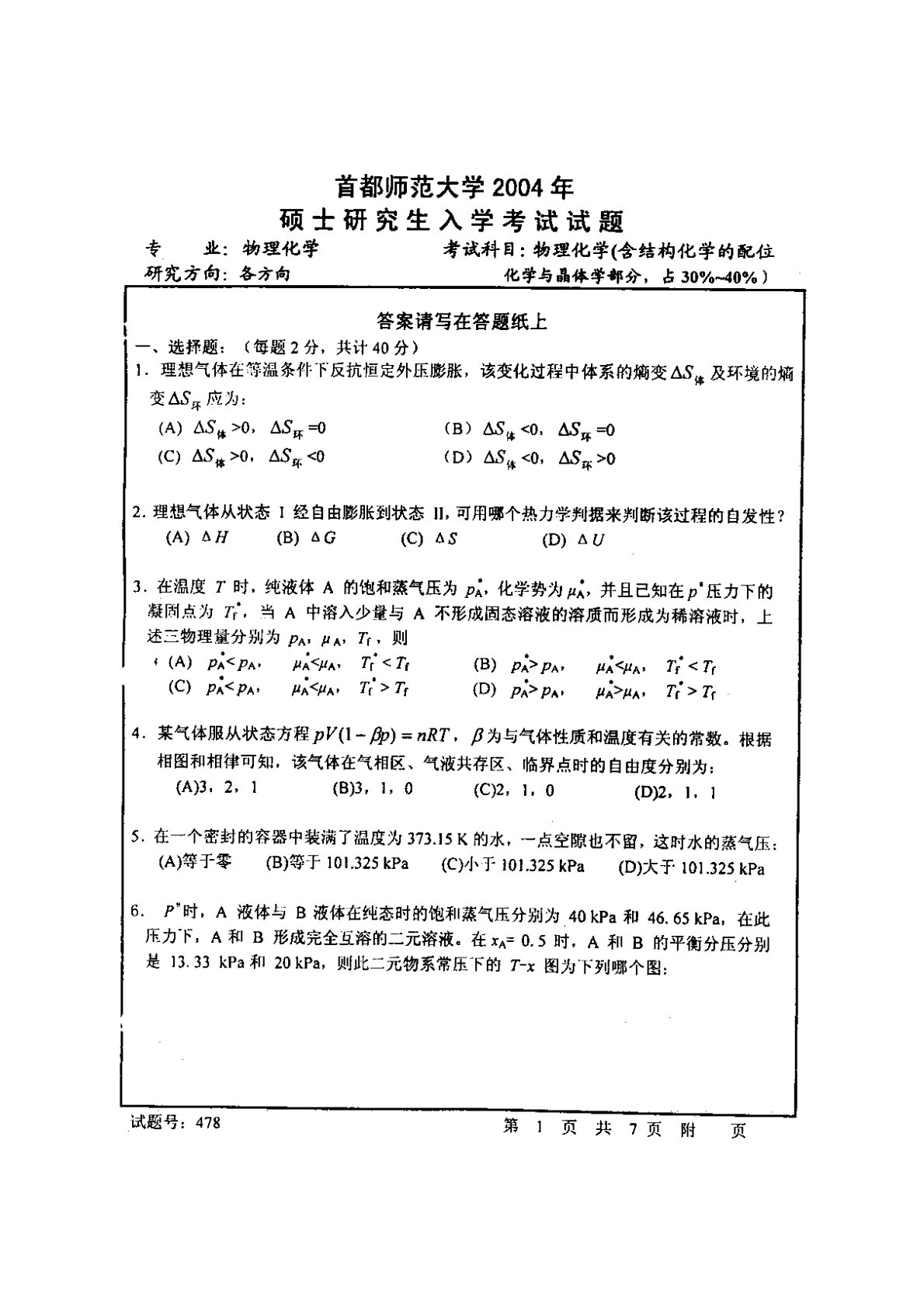 首都师范大学801物理化学2004年真题