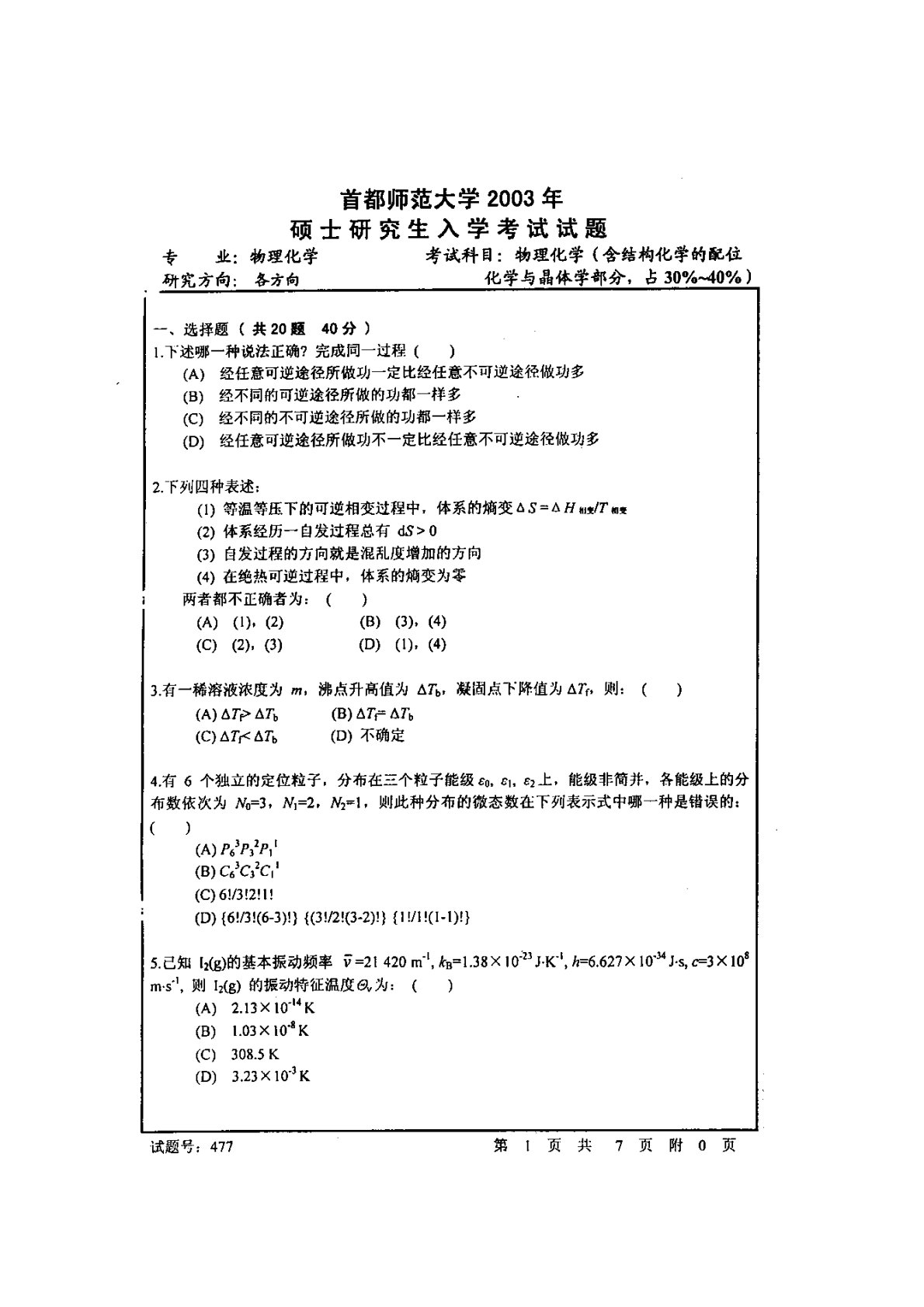 首都师范大学801物理化学2003年真题