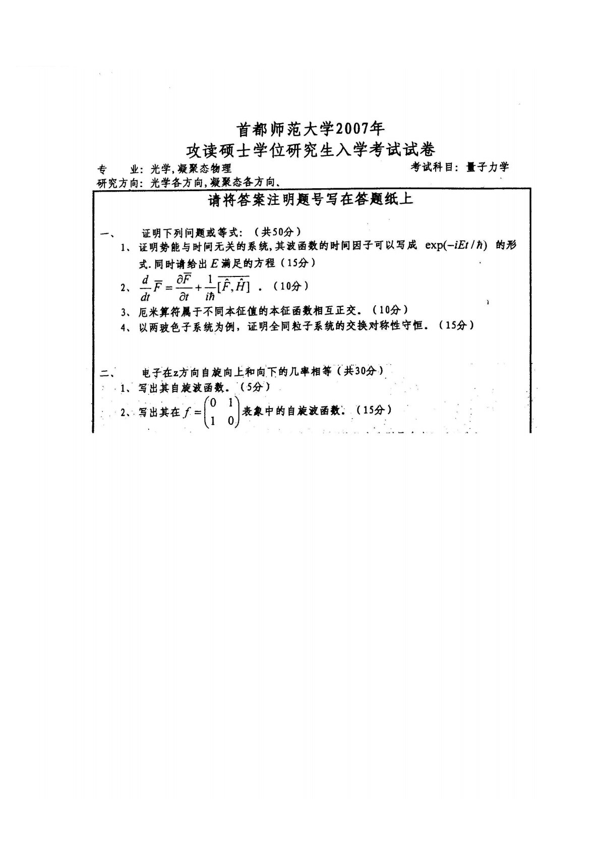 首都师范大学705量子力学2007年真题