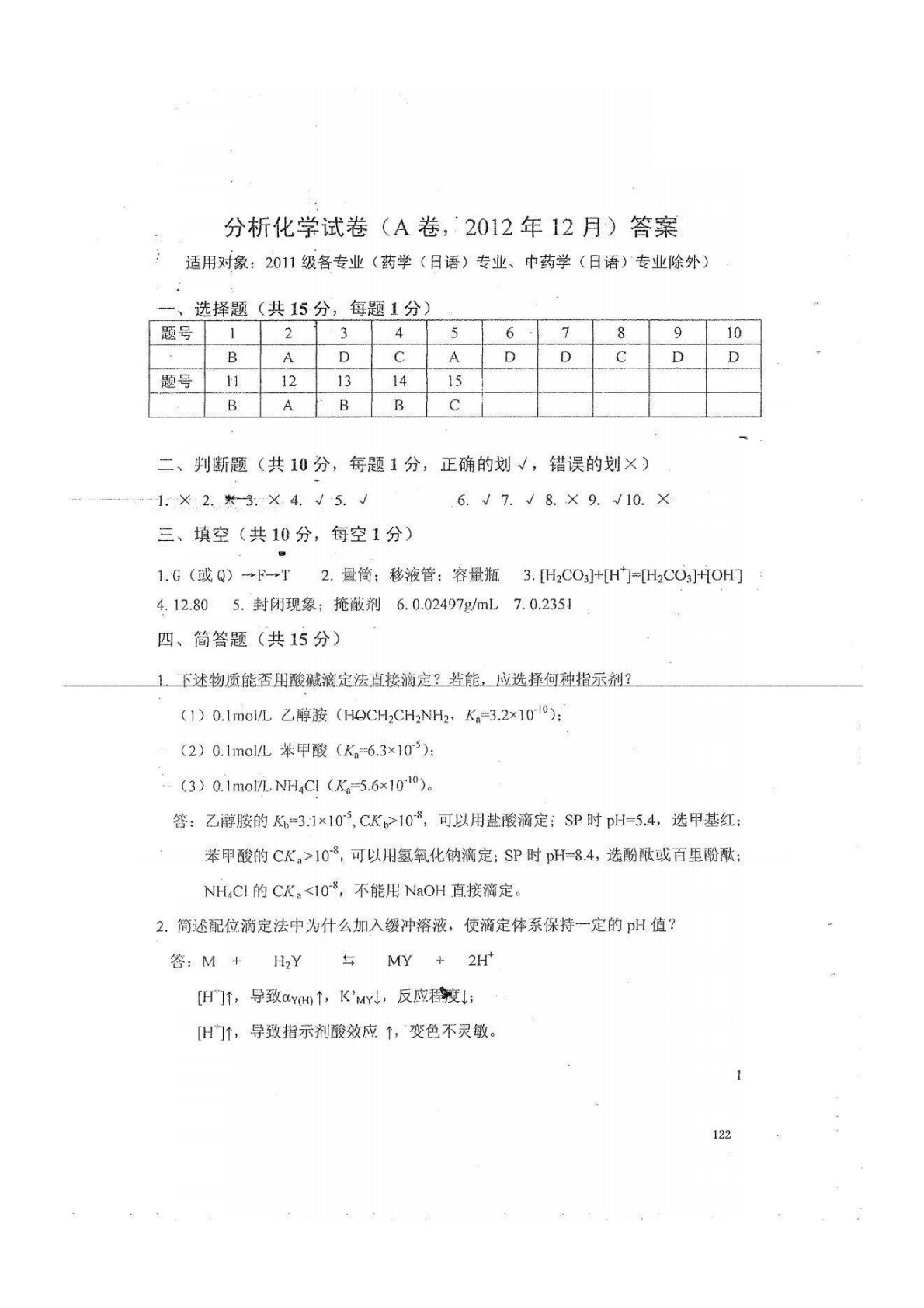 沈阳药科大学614分析化学2012年12月试卷答案