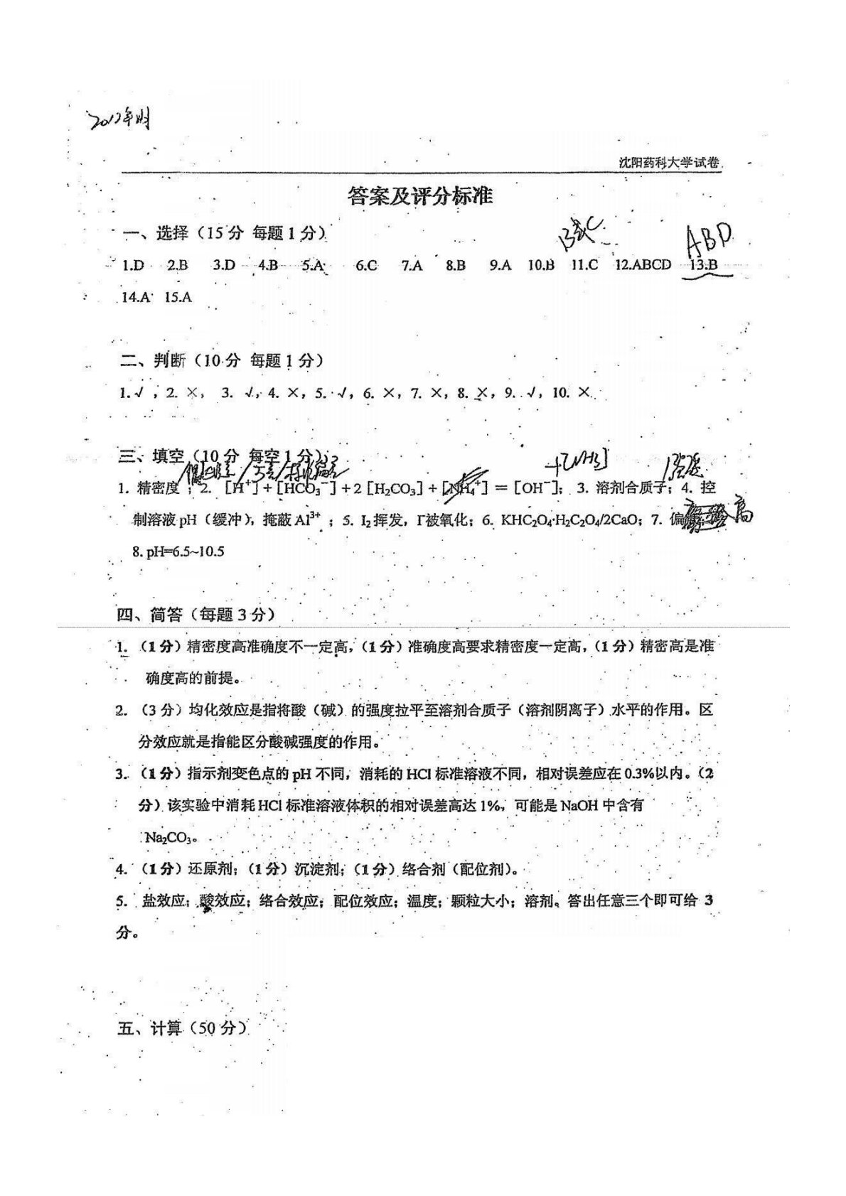 沈阳药科大学614分析化学2012年1月试卷答案