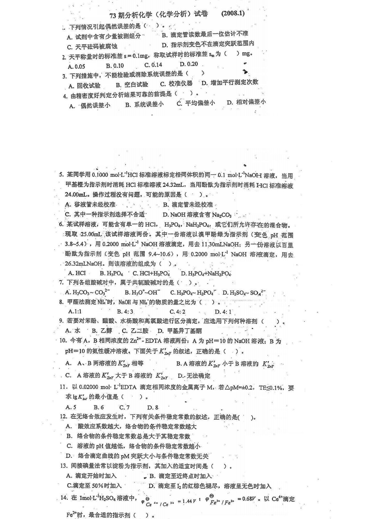 沈阳药科大学614分析化学2008年1月试卷