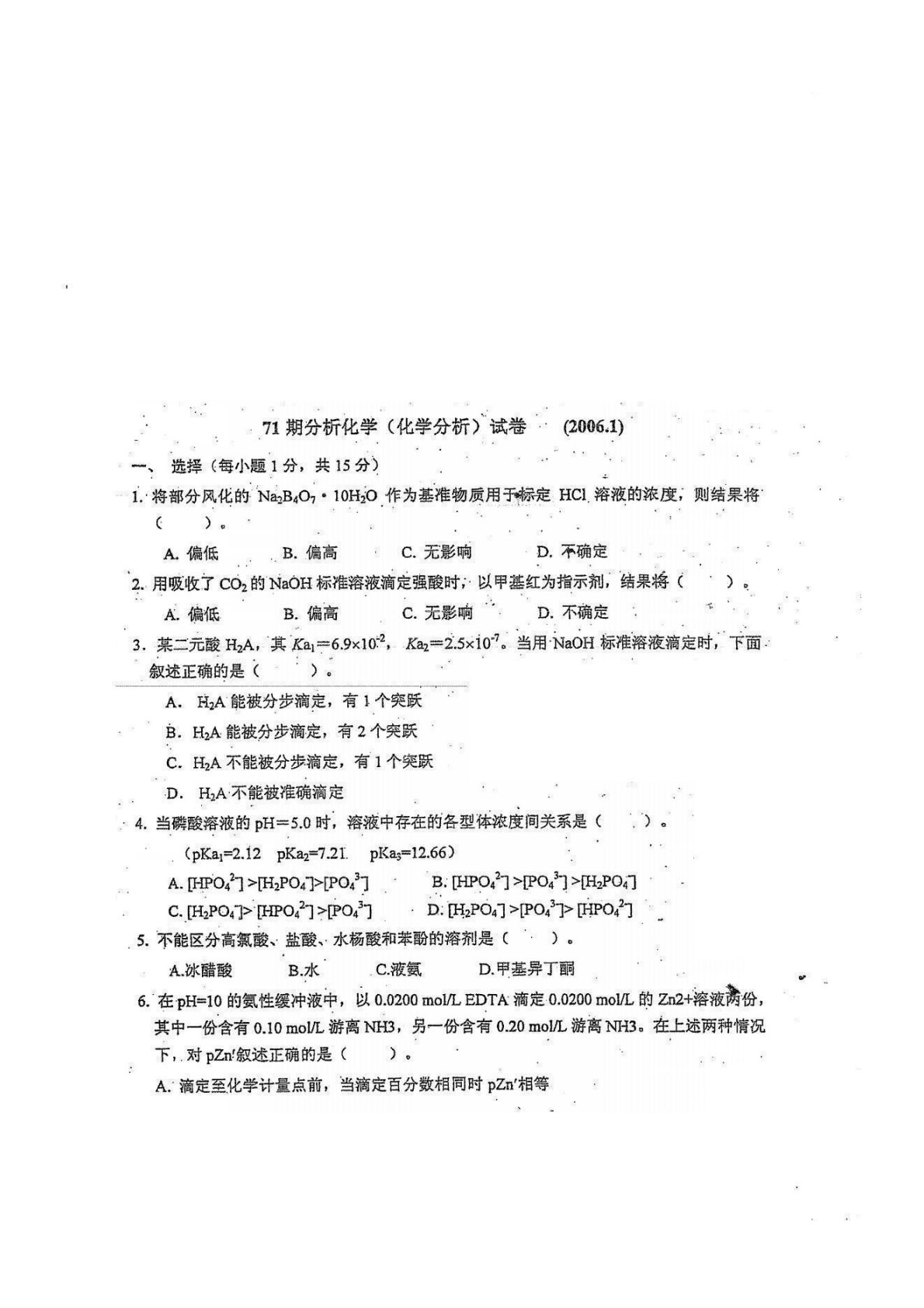 沈阳药科大学614分析化学2006年1月试卷