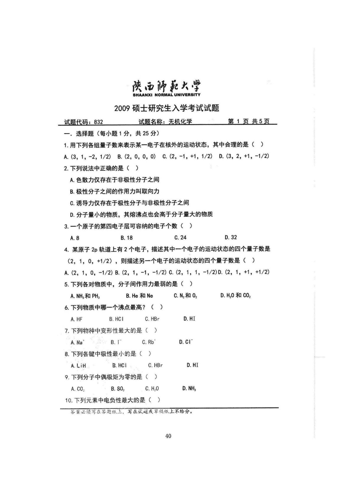 陕西师范大学832综合化学2009年真题(无机化学)