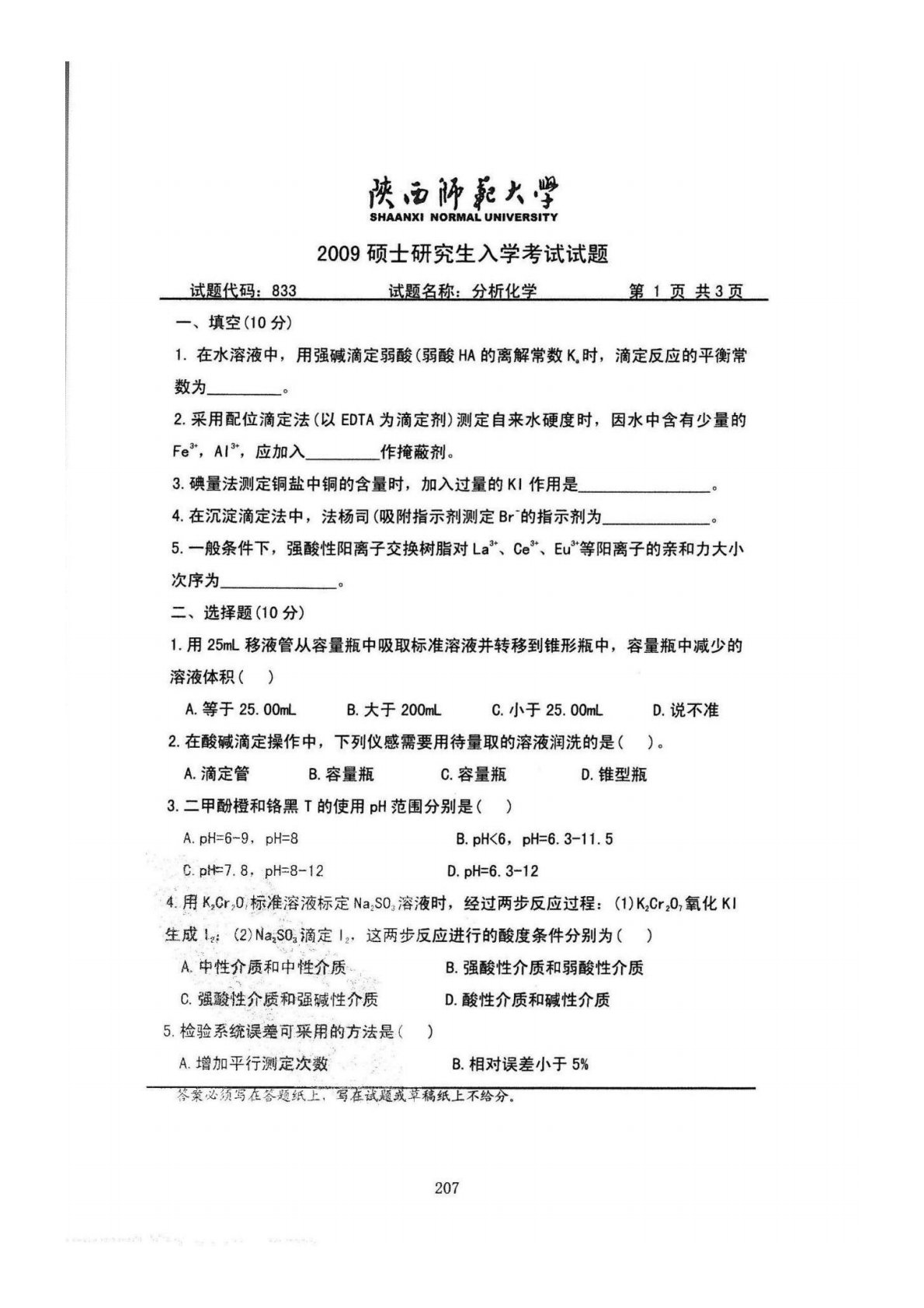 陕西师范大学832综合化学2009年真题(分析化学)