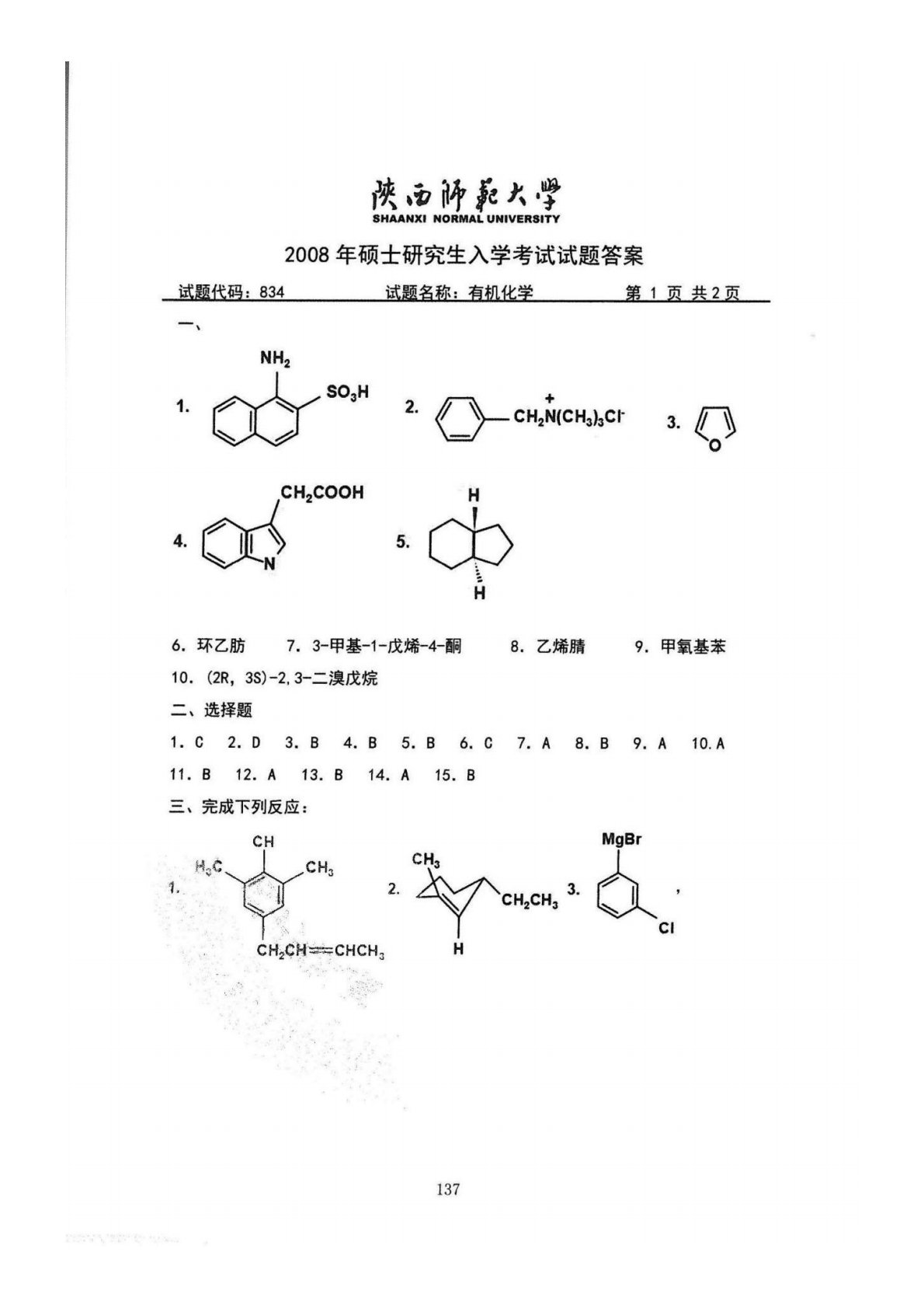 陕西师范大学832综合化学2008年真题答案(有机化学)