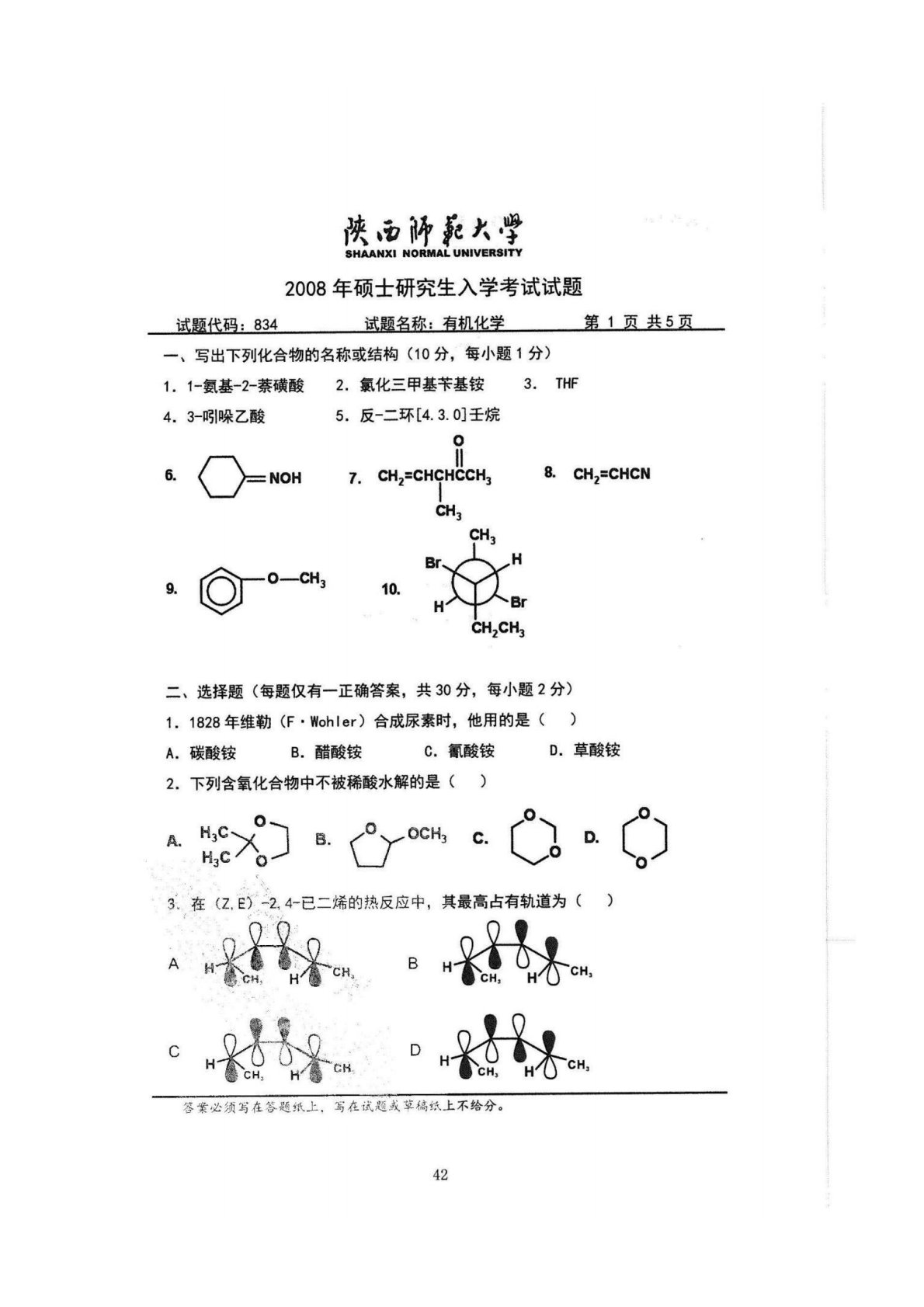 陕西师范大学832综合化学2008年真题(有机化学)