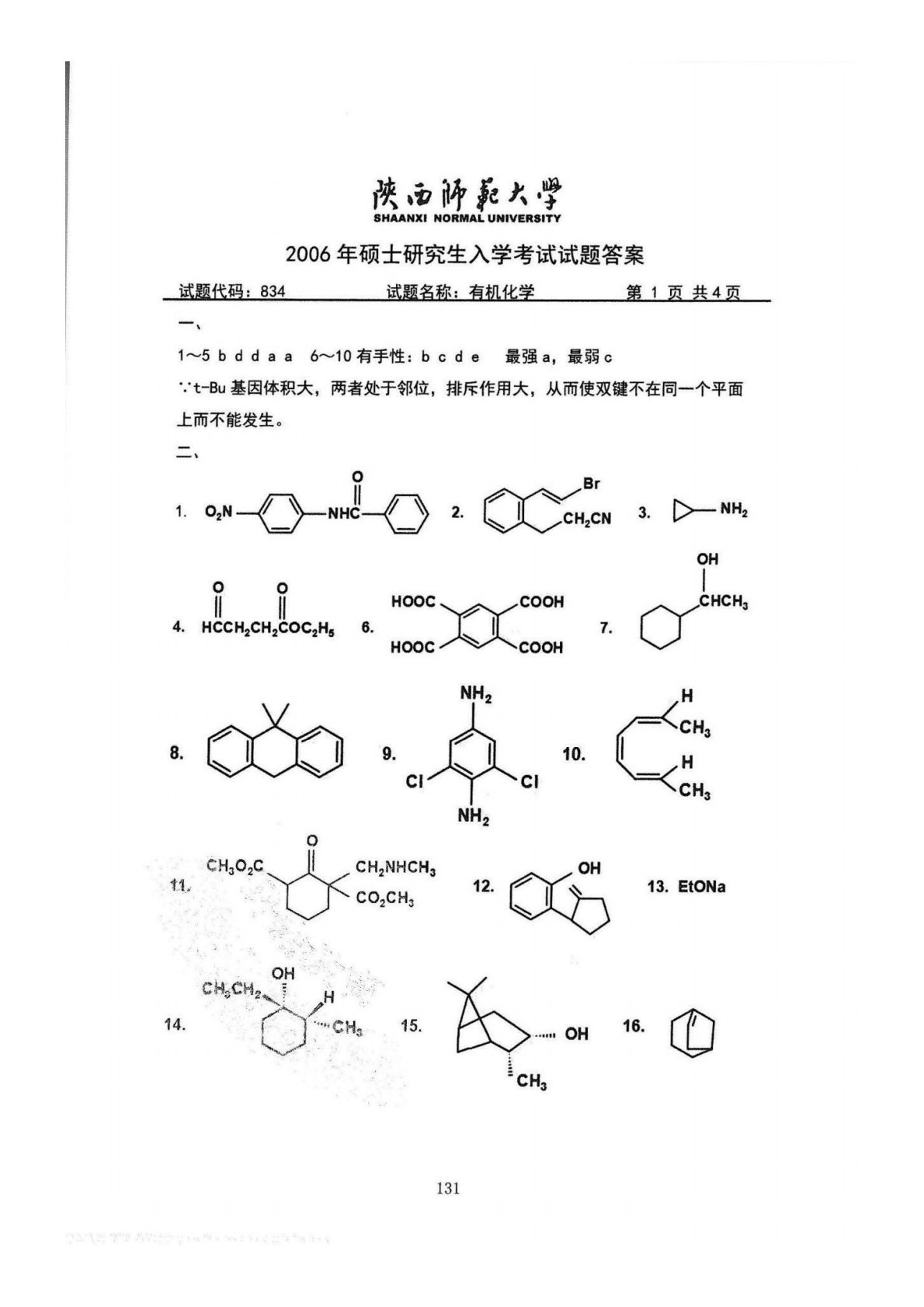 陕西师范大学832综合化学2006年真题答案(有机化学)