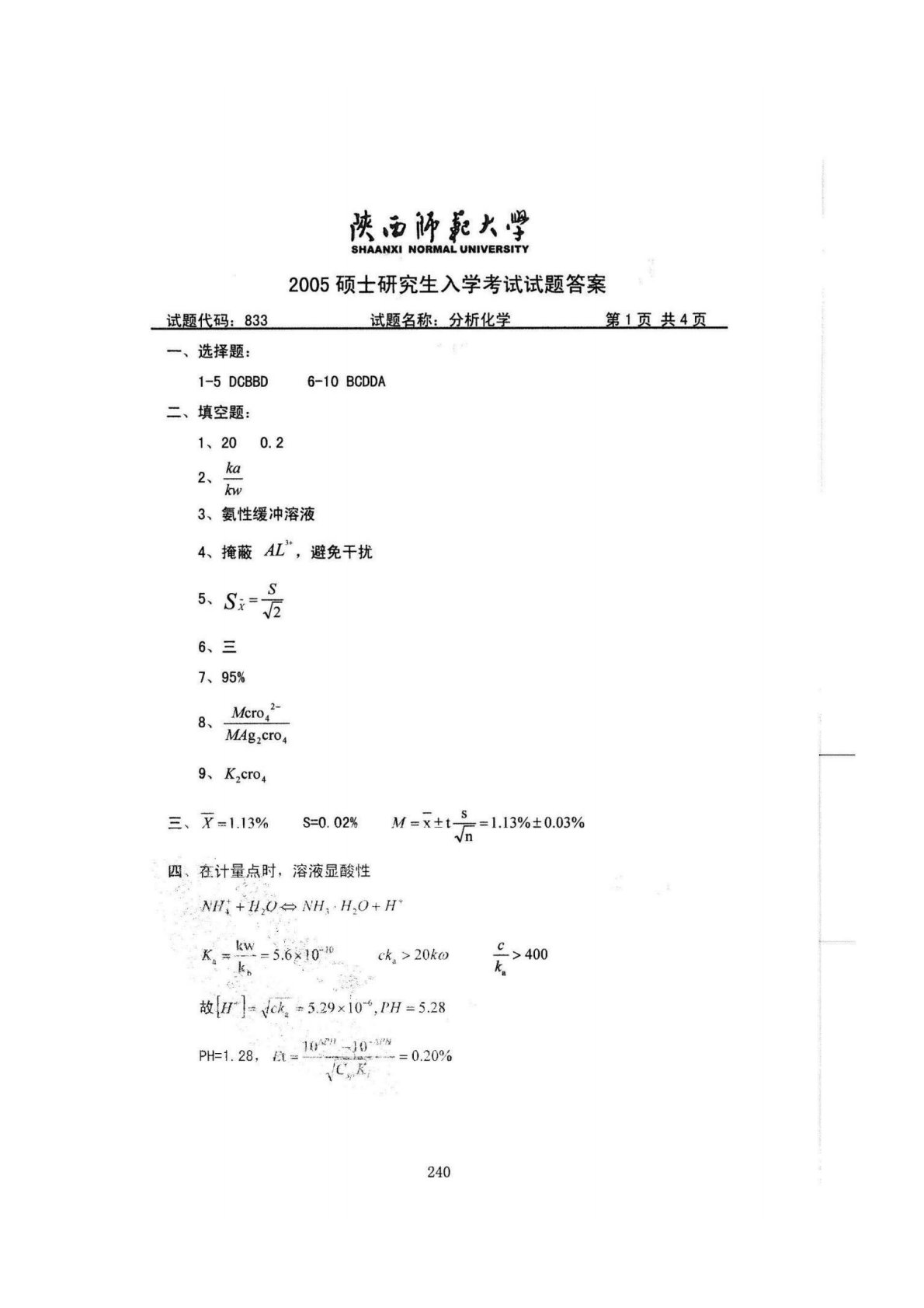 陕西师范大学832综合化学2005年真题答案(分析化学)