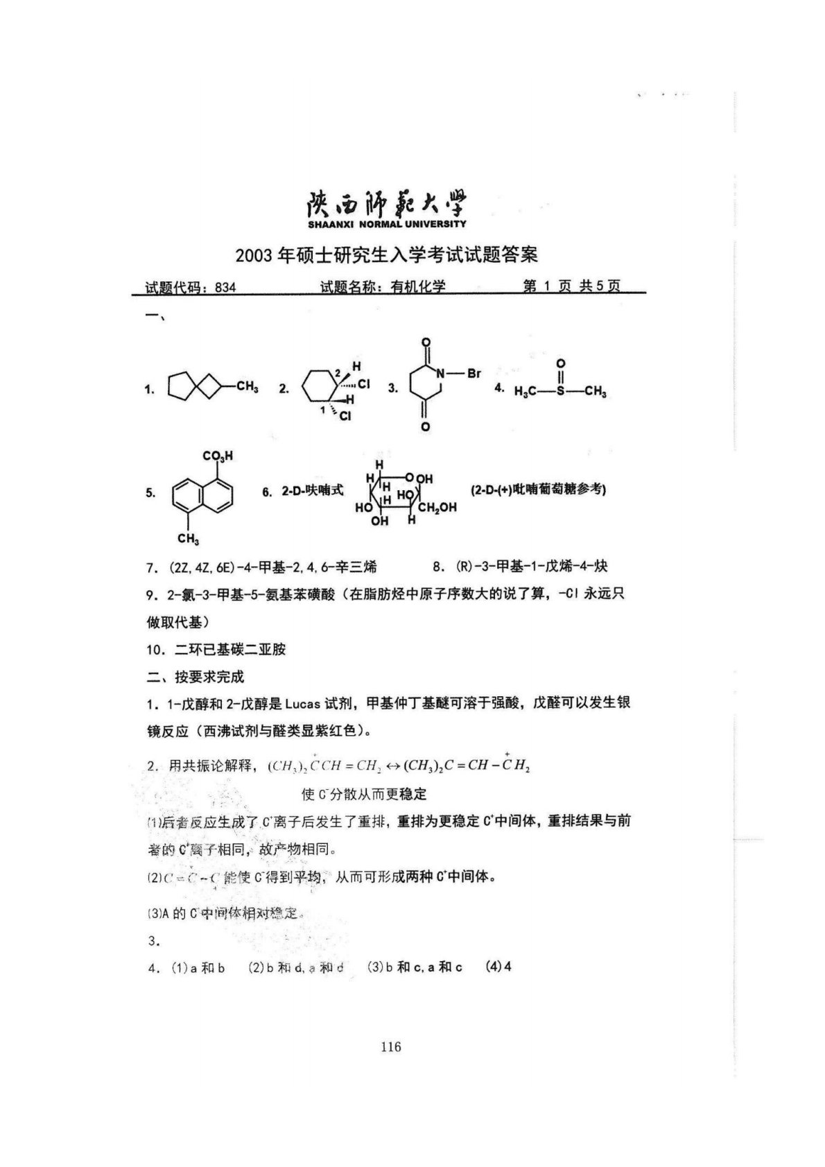 陕西师范大学832综合化学2003年真题答案(有机化学)