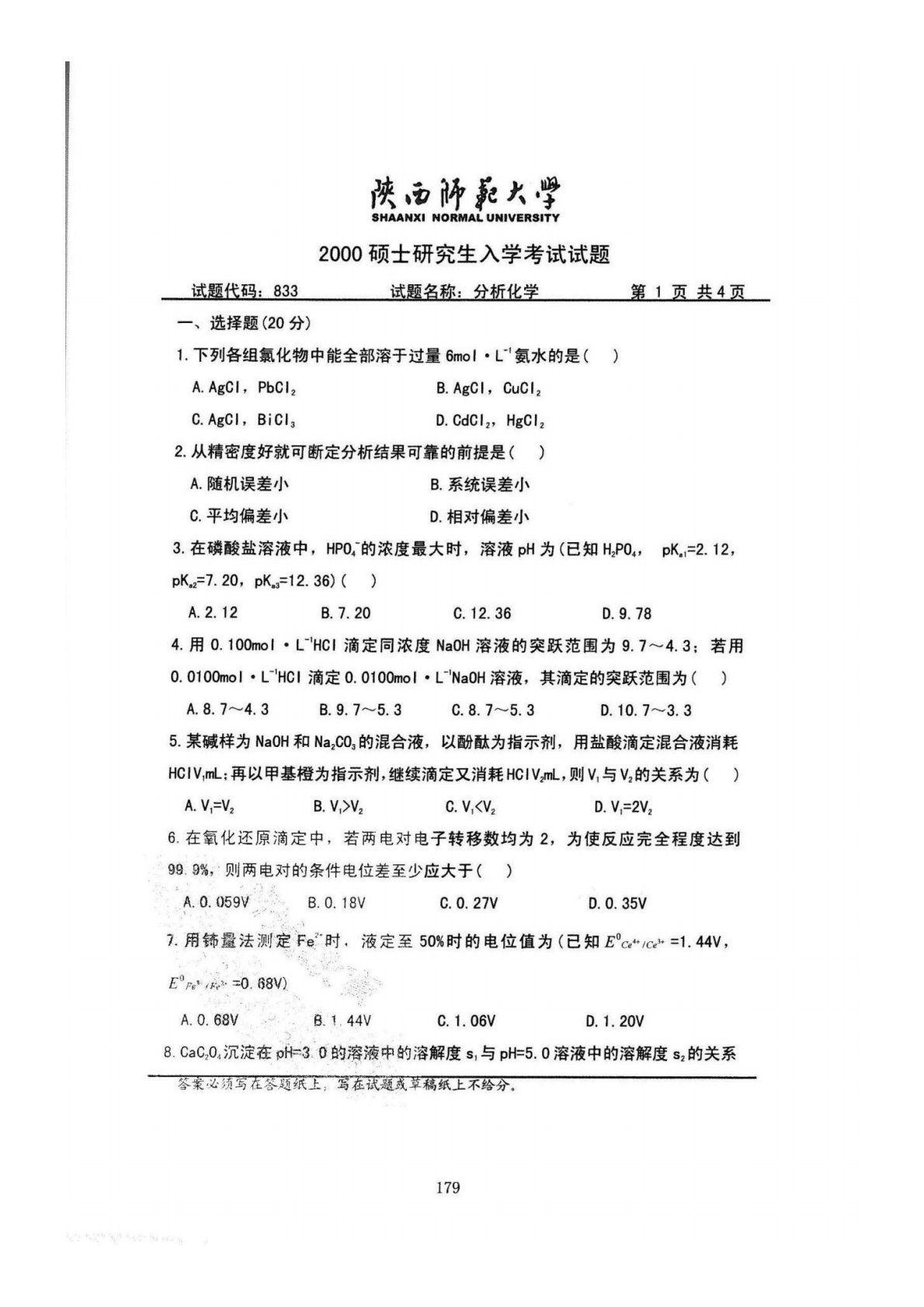 陕西师范大学832综合化学2000年真题(分析化学)