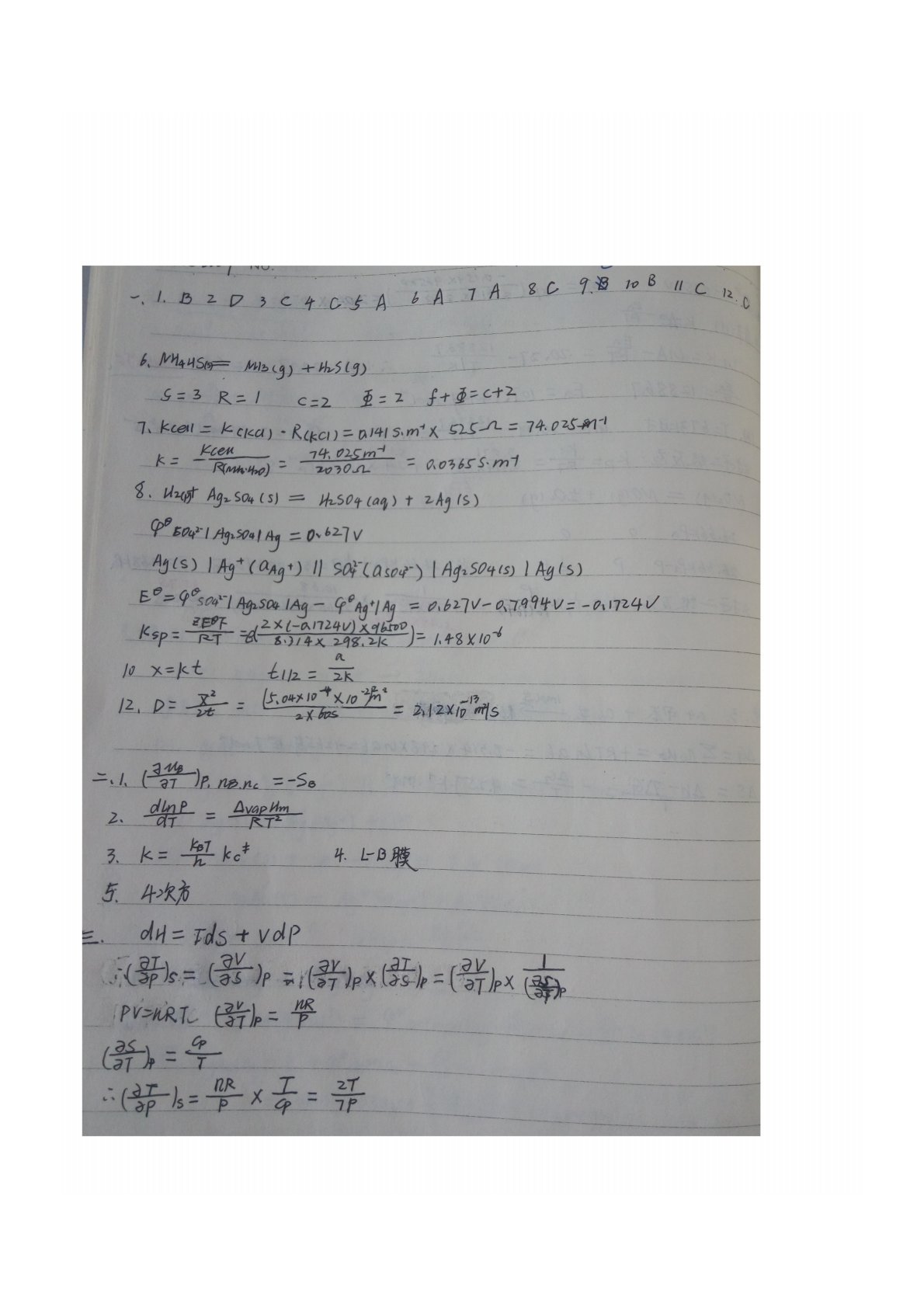 陕西师范大学730物理化学(含结构化学)2009年真题答案手写版