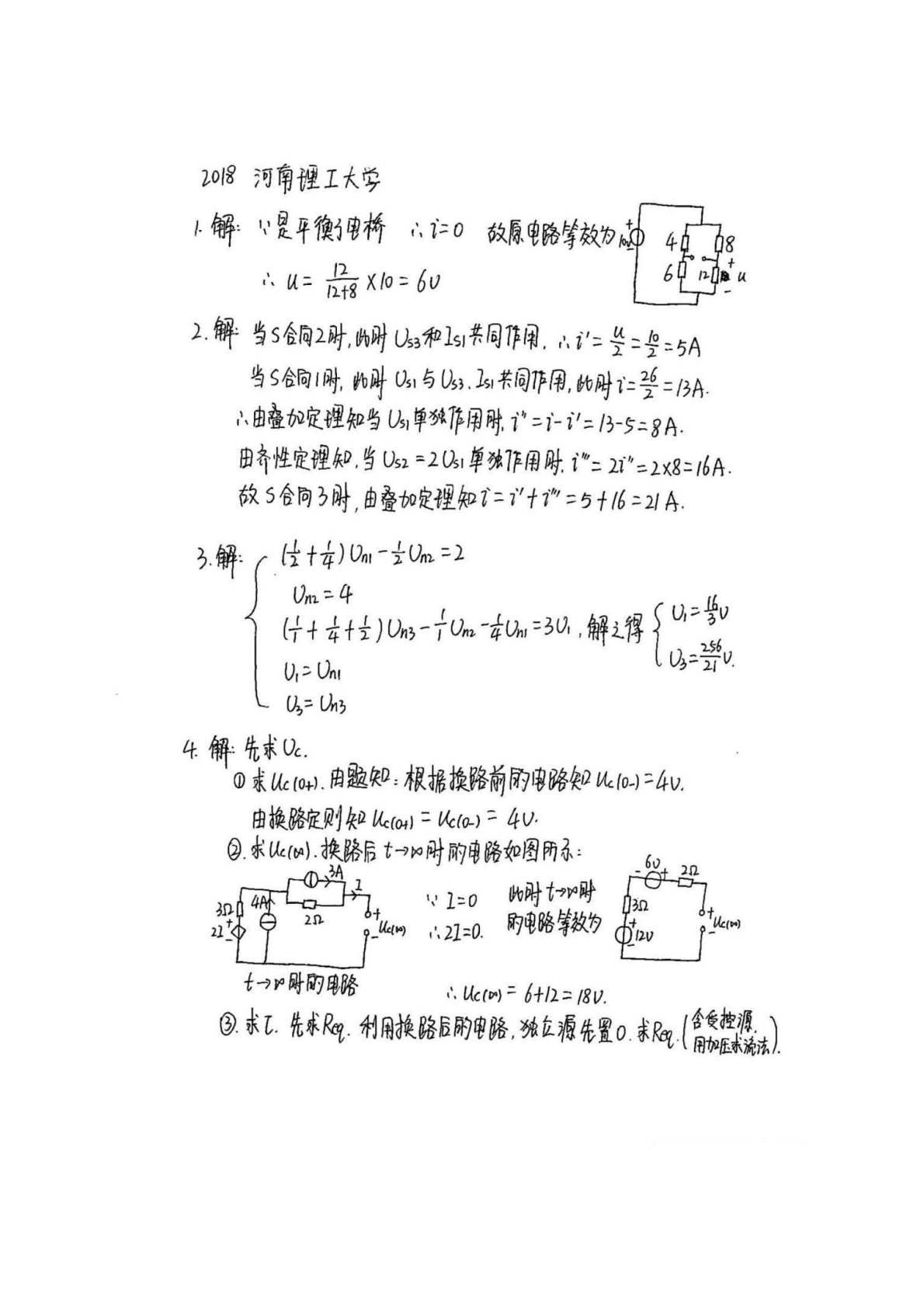河南理工大学844电路理论2018年真题答案手写版