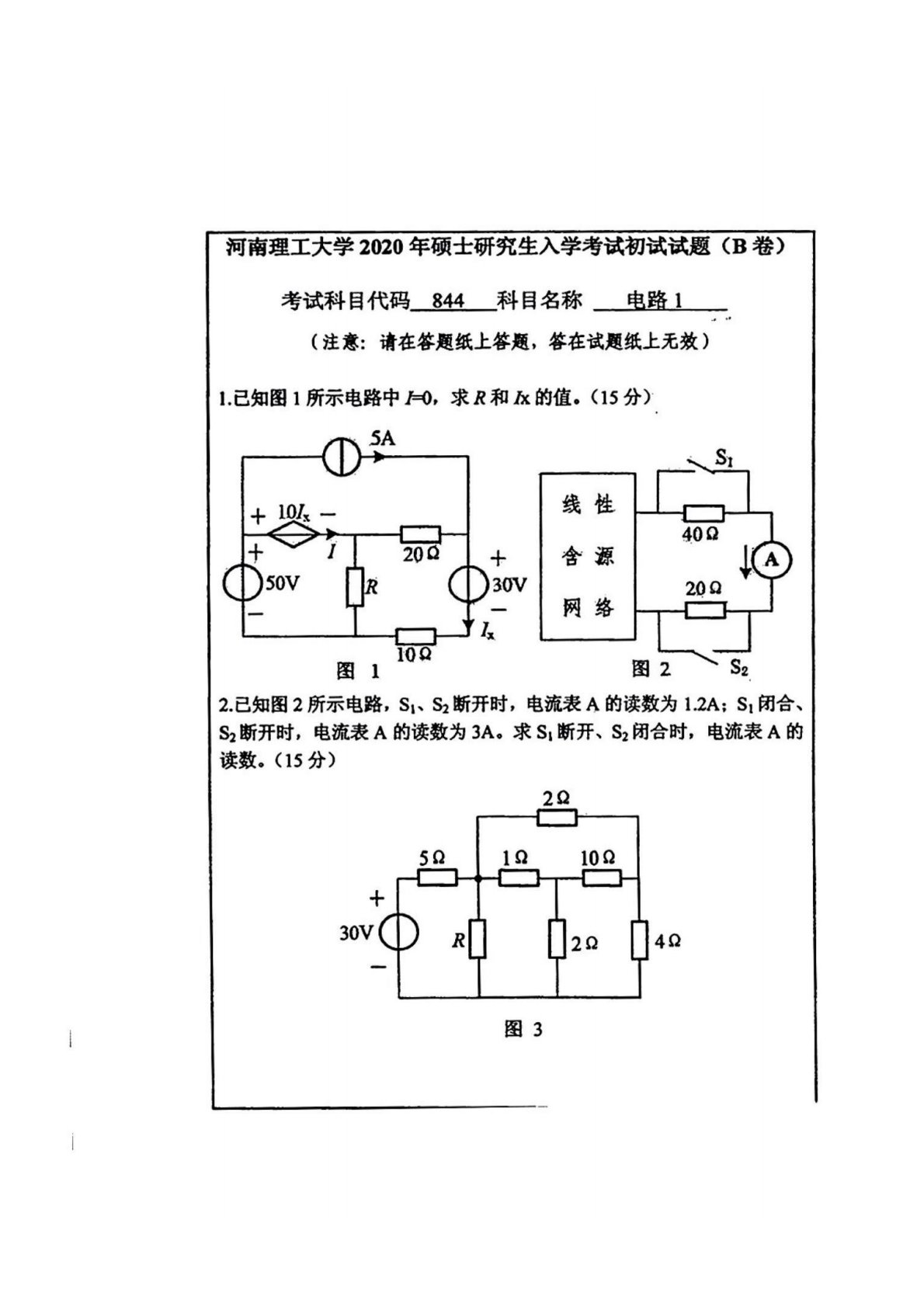 河南理工大学844电路理论2020年真题
