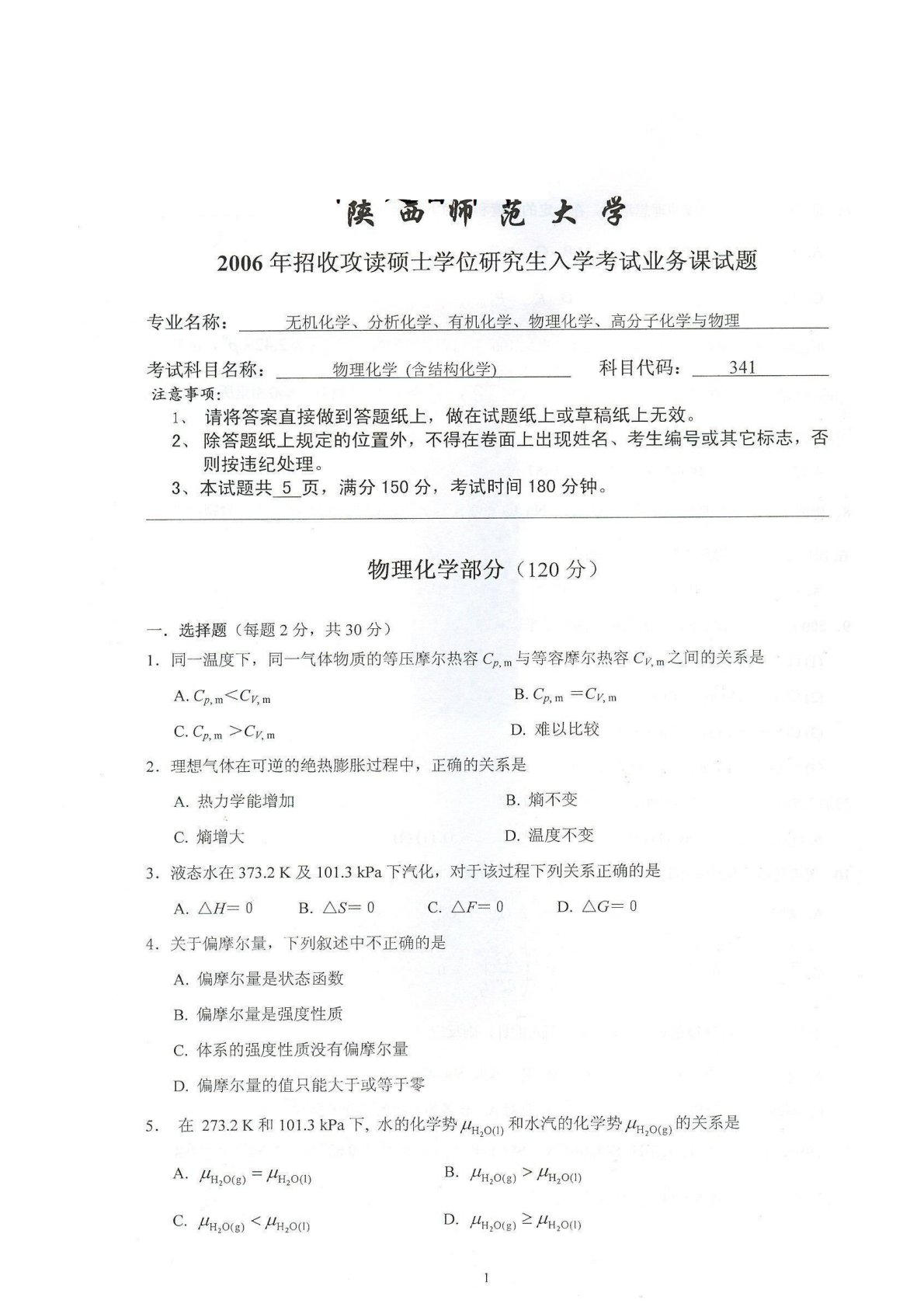 陕西师范大学730物理化学(含结构化学)2006年真题