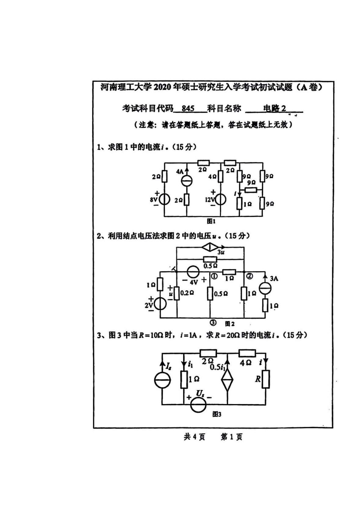 河南理工大学844电路理论2020年真题1