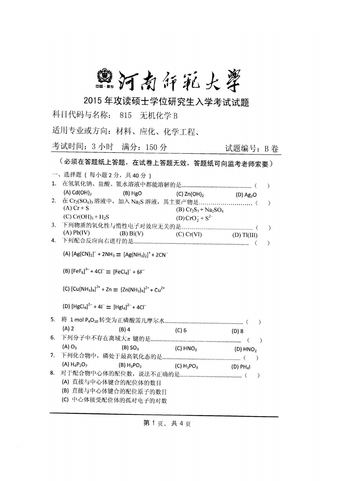 河南师范大学0307无机化学B2015年真题