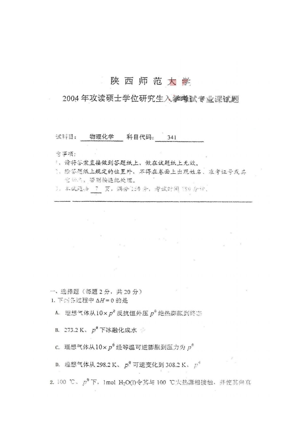 陕西师范大学730物理化学(含结构化学)2004年真题